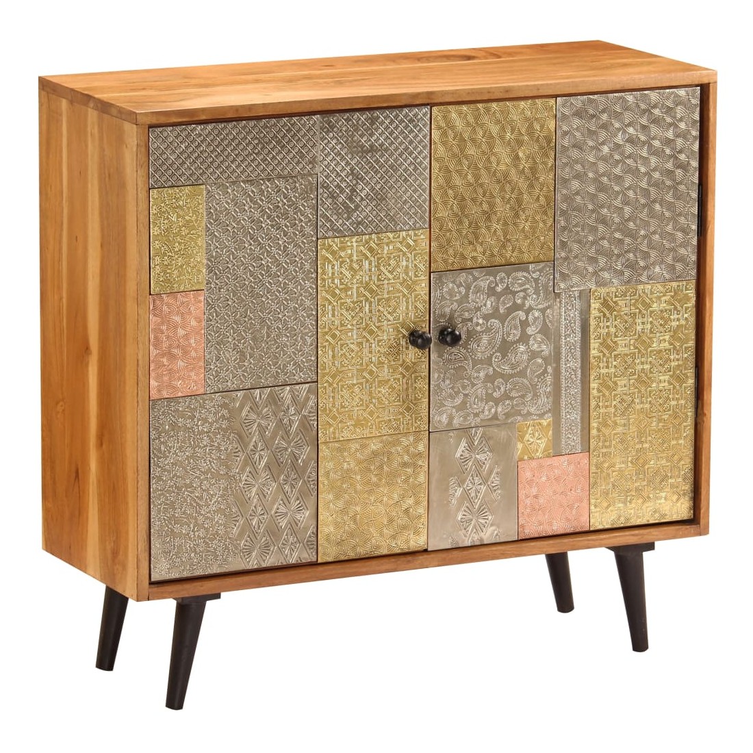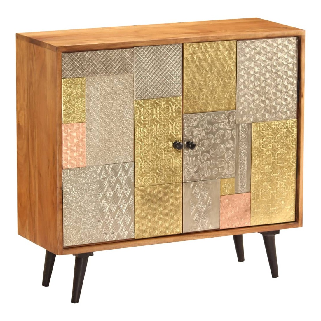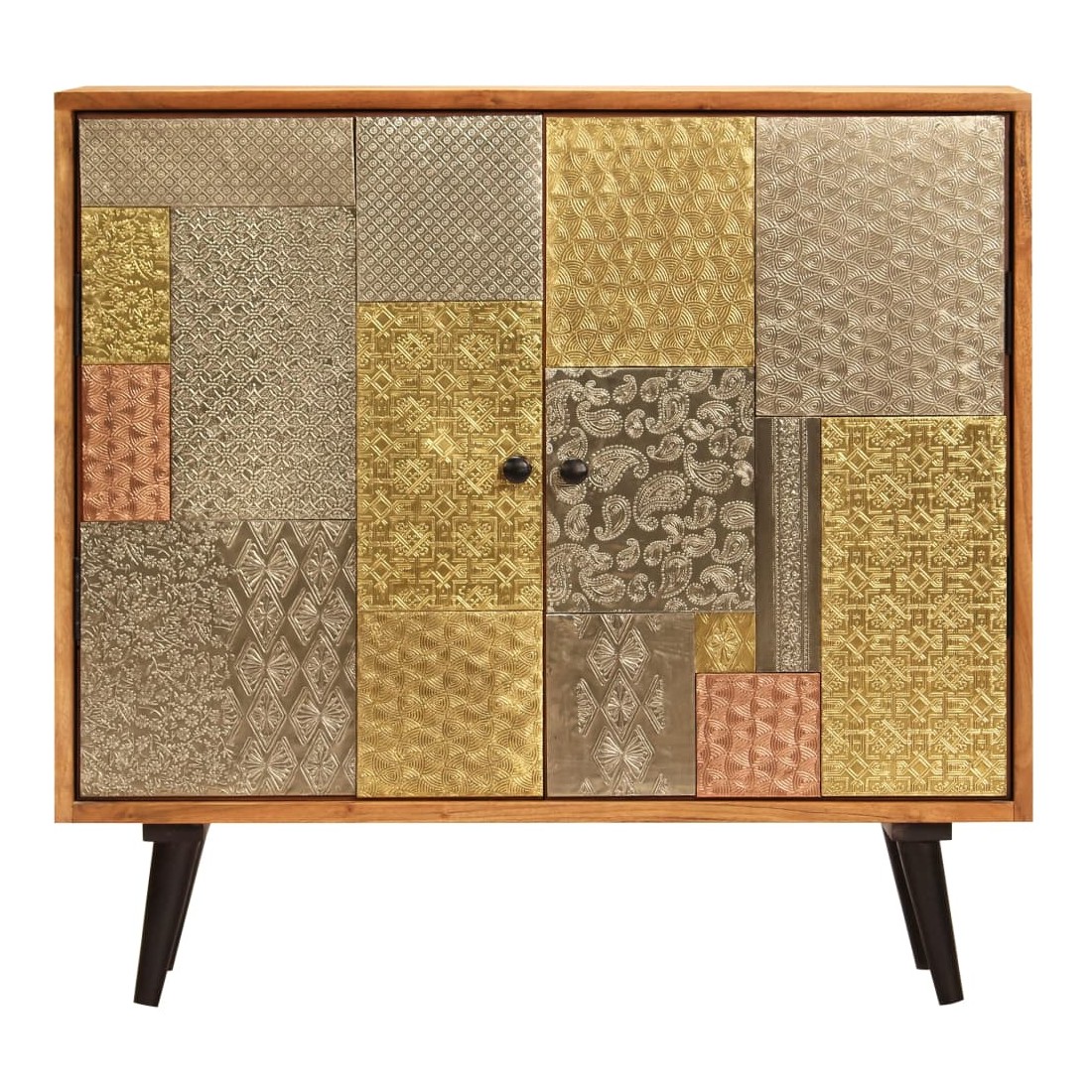 Ce buffet dégage un charme vintage spécial qui ajoutera un élément accrocheur à votre décoration intérieure. Cette armoire est faite de bois massif d'acacia avec une subtile finition à la couleur de miel, ce qui lui donne un bel aspect et une couleur chaude. Les beaux détails décoratifs en métal de différentes couleurs et les poignées de style antique confèrent à ce meuble en bois une touche de charme luxueux. Un travail artisanal de haute qualité et des belles nervures de bois rendent chaque meuble unique et légèrement différent l'un de l'autre. Ce placard comporte 2 armoires avec portes, qui offrent suffisamment d'espace de rangement pour vos vêtements, livres et autres articles divers. Remarque importante : Les couleurs et le grain du bois peuvent varier d'une pièce à l'autre, ce qui rend chaque commode unique. La livraison est aléatoire, ce qui garantit l'exclusivité et l'individualité de votre produit.