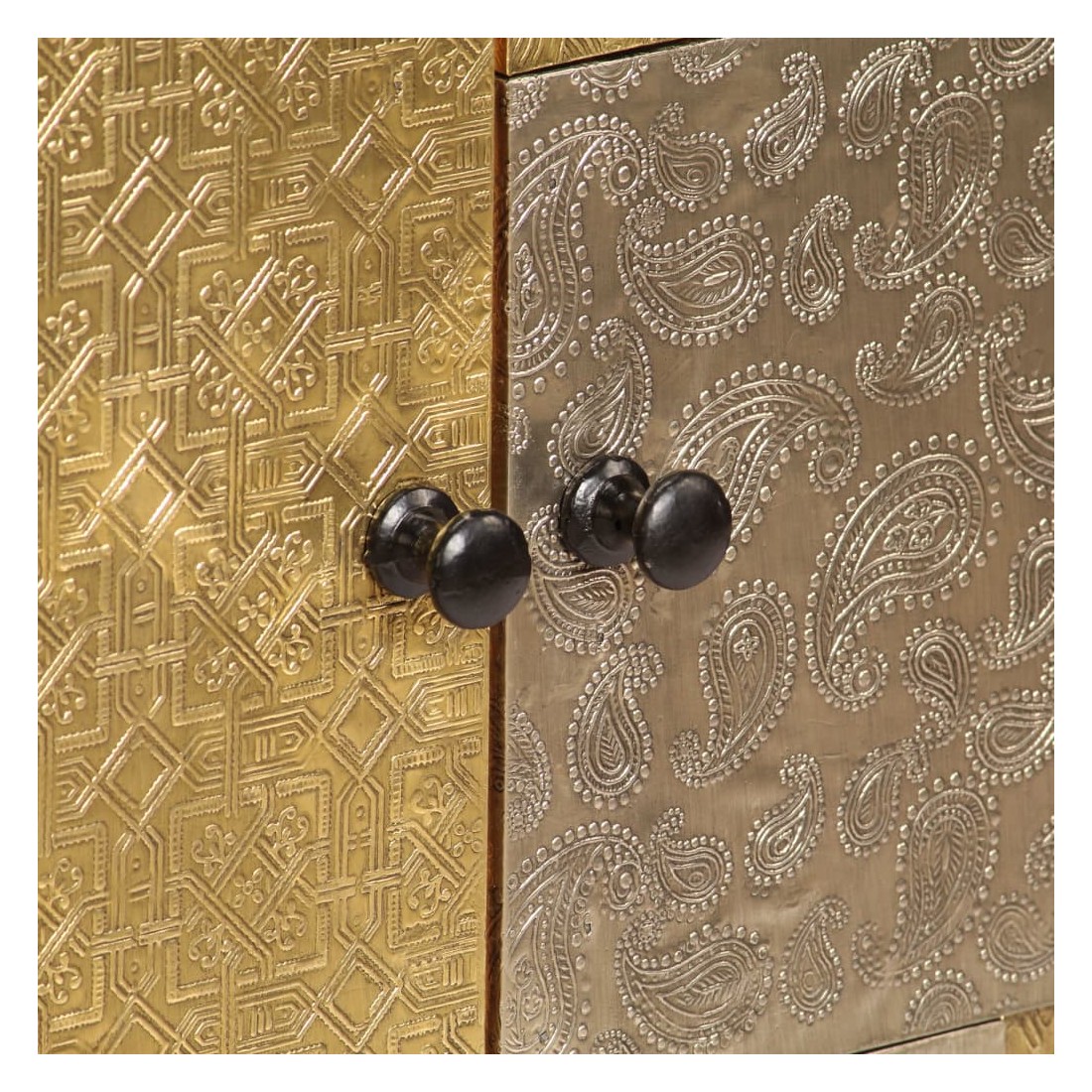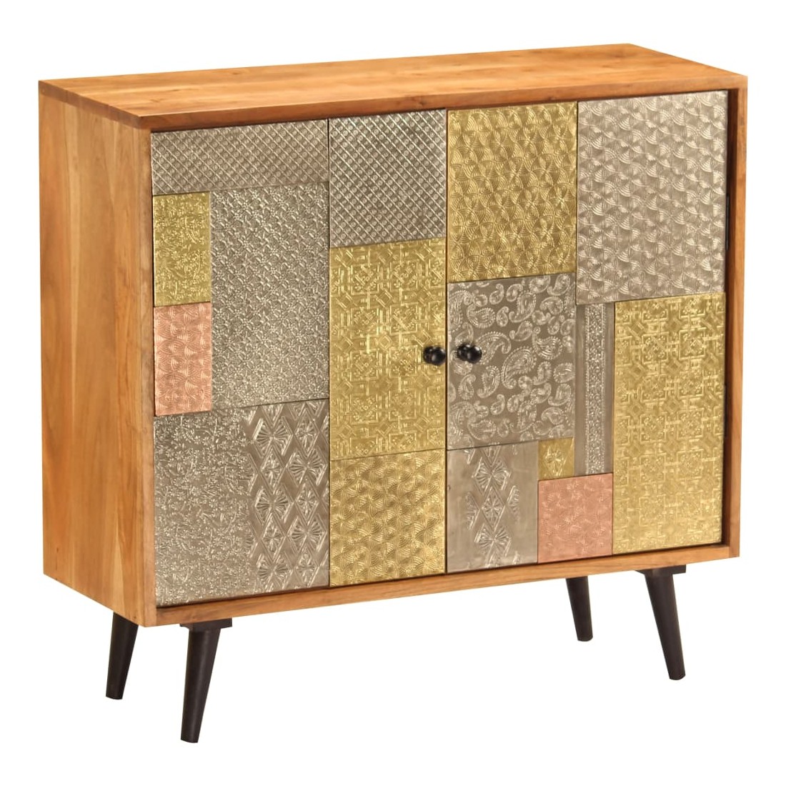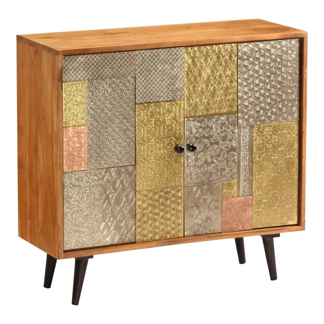 Ce buffet dégage un charme vintage spécial qui ajoutera un élément accrocheur à votre décoration intérieure. Cette armoire est faite de bois massif d'acacia avec une subtile finition à la couleur de miel, ce qui lui donne un bel aspect et une couleur chaude. Les beaux détails décoratifs en métal de différentes couleurs et les poignées de style antique confèrent à ce meuble en bois une touche de charme luxueux. Un travail artisanal de haute qualité et des belles nervures de bois rendent chaque meuble unique et légèrement différent l'un de l'autre. Ce placard comporte 2 armoires avec portes, qui offrent suffisamment d'espace de rangement pour vos vêtements, livres et autres articles divers. Remarque importante : Les couleurs et le grain du bois peuvent varier d'une pièce à l'autre, ce qui rend chaque commode unique. La livraison est aléatoire, ce qui garantit l'exclusivité et l'individualité de votre produit.