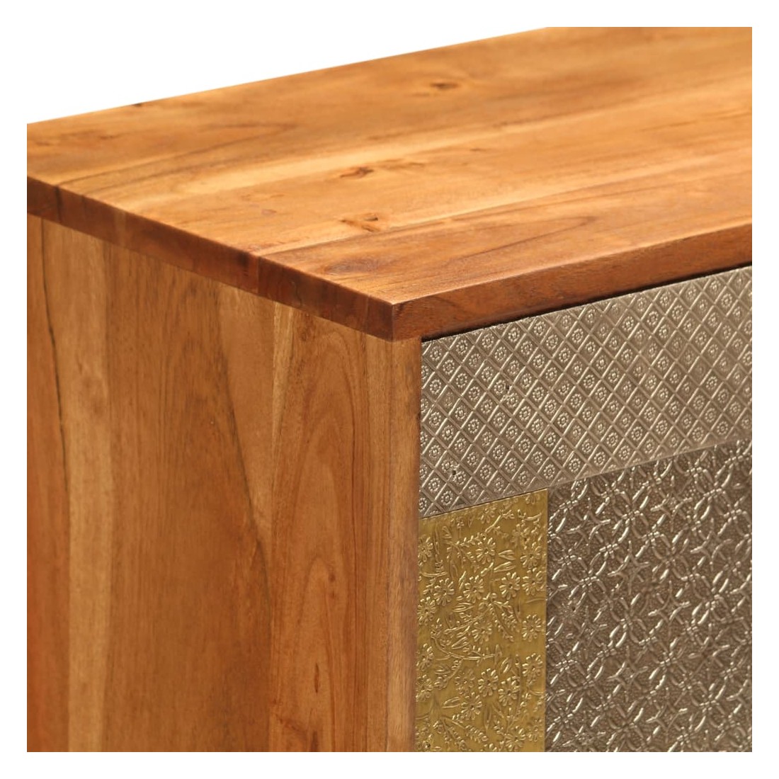 Ce buffet dégage un charme vintage spécial qui ajoutera un élément accrocheur à votre décoration intérieure. Cette armoire est faite de bois massif d'acacia avec une subtile finition à la couleur de miel, ce qui lui donne un bel aspect et une couleur chaude. Les beaux détails décoratifs en métal de différentes couleurs et les poignées de style antique confèrent à ce meuble en bois une touche de charme luxueux. Un travail artisanal de haute qualité et des belles nervures de bois rendent chaque meuble unique et légèrement différent l'un de l'autre. Ce placard comporte 2 armoires avec portes, qui offrent suffisamment d'espace de rangement pour vos vêtements, livres et autres articles divers. Remarque importante : Les couleurs et le grain du bois peuvent varier d'une pièce à l'autre, ce qu