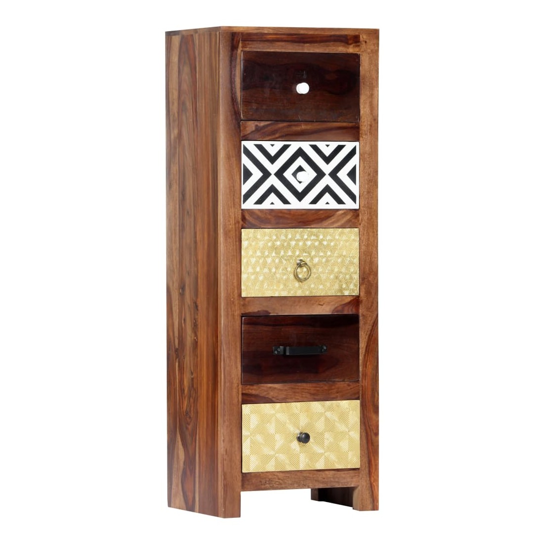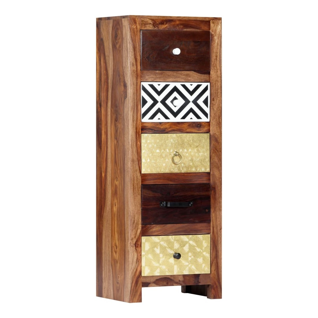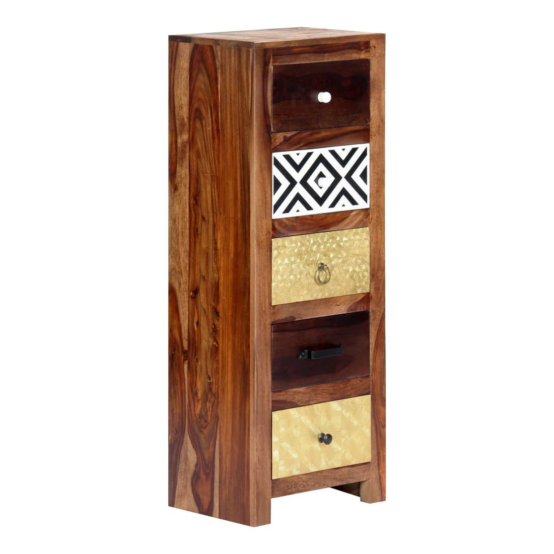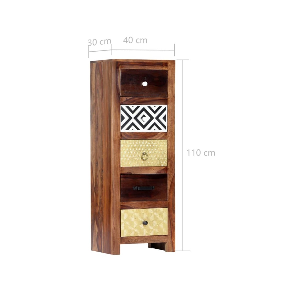Introduisez une touche de charme exotique dans votre décoration intérieure avec notre armoire latérale en bois élégante et pratique ! Elle peut également être utilisée comme commode ou armoire à tiroirs. Faite de bois massif avec un motif mélangé délicat, cette armoire à tiroirs durable dégage un charme vintage. Il également connu sous le nom de bois de rose ou palissandre, est un bois dur tropical réputé pour son grain riche. Le bois a reçu une belle finition grâce au polissage, à la peinture et au laquage, ce qui donne à l'armoire latérale une apparence raffinée. De plus, les 5 tiroirs offrent un espace suffisant pour garder les articles organisés et à portée de main. L'assemblage est facile. Remarque importante : les couleurs varient d'une pièce à l'autre, rendant chaque pièce uniqu