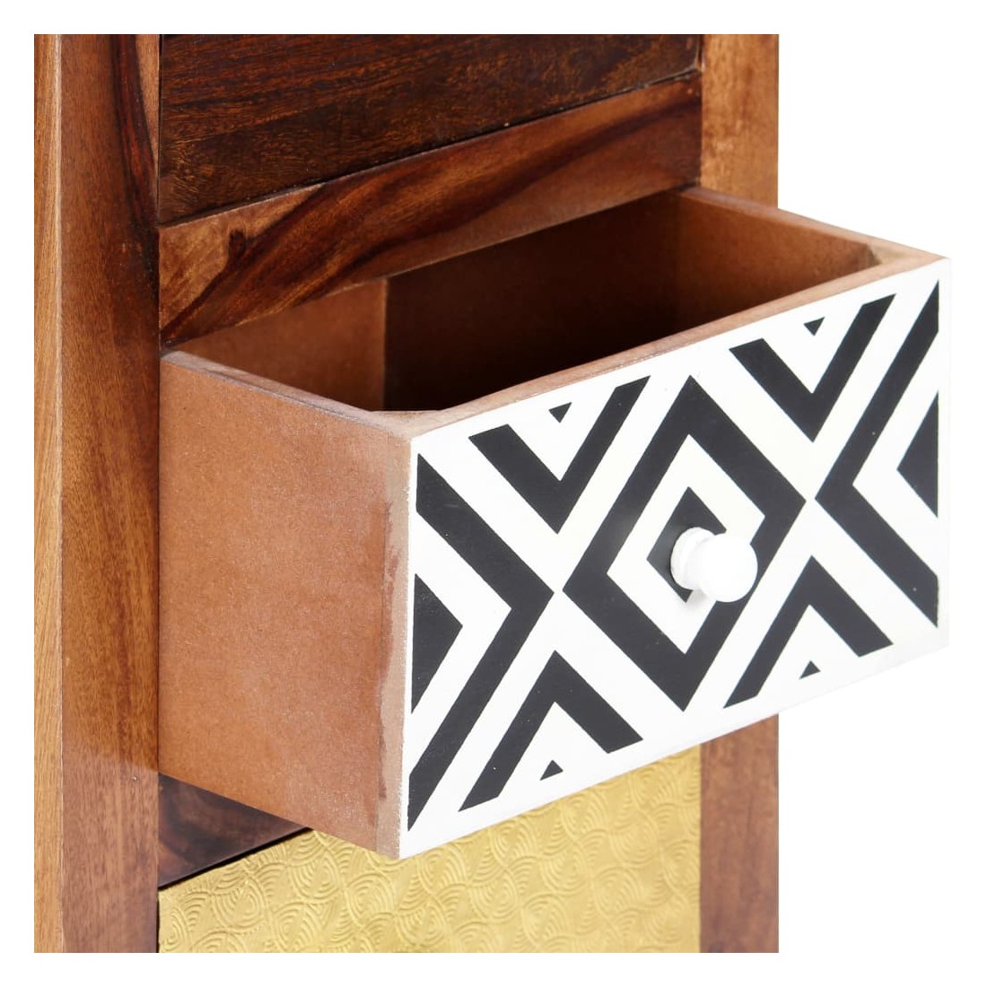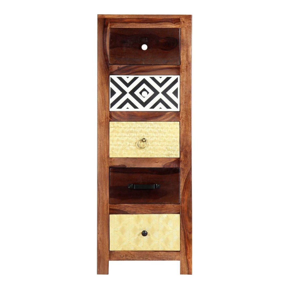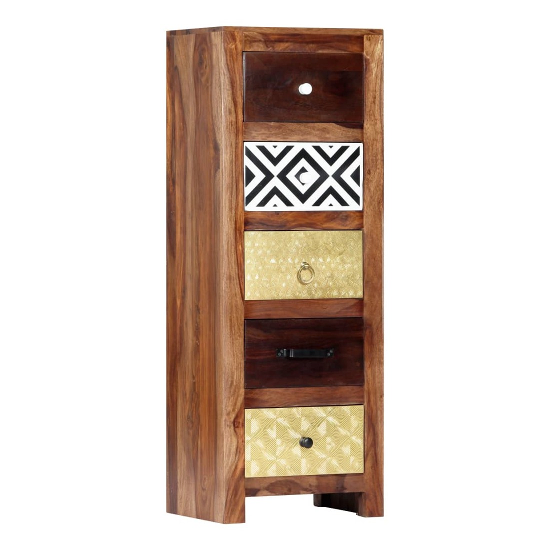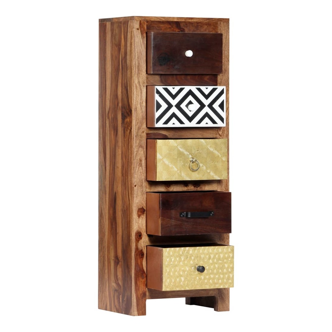 Introduisez une touche de charme exotique dans votre décoration intérieure avec notre armoire latérale en bois élégante et pratique ! Elle peut également être utilisée comme commode ou armoire à tiroirs. Faite de bois massif avec un motif mélangé délicat, cette armoire à tiroirs durable dégage un charme vintage. Il également connu sous le nom de bois de rose ou palissandre, est un bois dur tropical réputé pour son grain riche. Le bois a reçu une belle finition grâce au polissage, à la peinture et au laquage, ce qui donne à l'armoire latérale une apparence raffinée. De plus, les 5 tiroirs offrent un espace suffisant pour garder les articles organisés et à portée de main. L'assemblage est facile. Remarque importante : les couleurs varient d'une pièce à l'autre, rendant chaque pièce uniqu