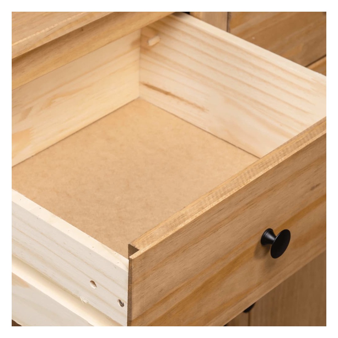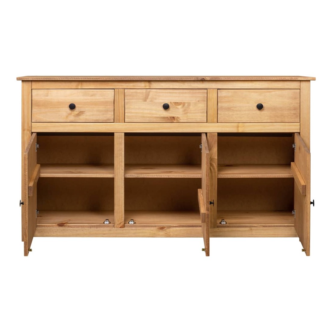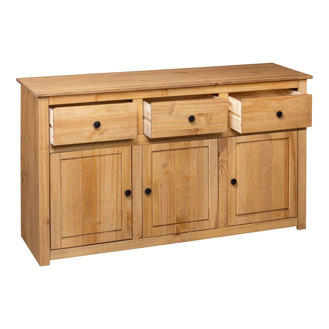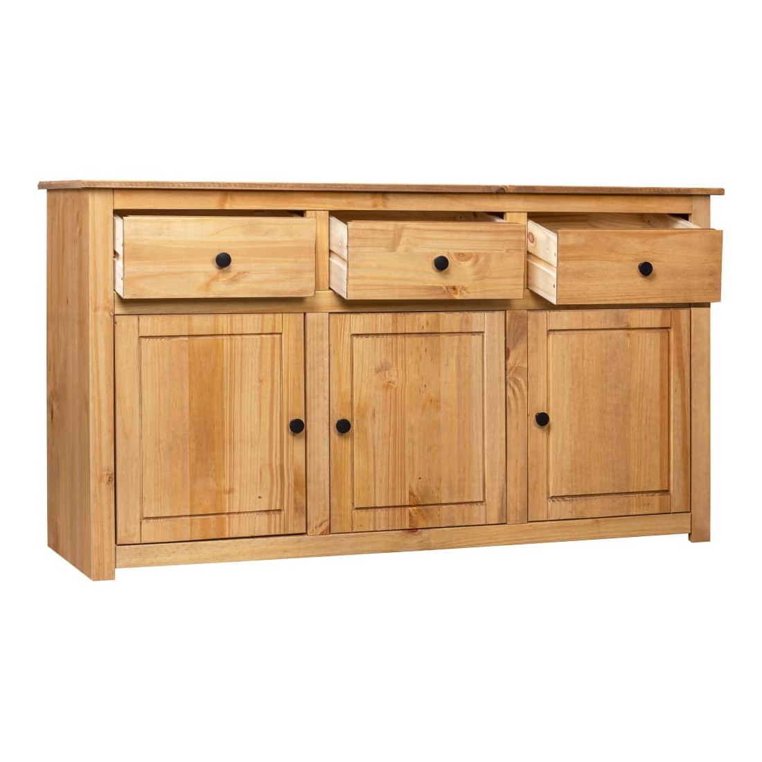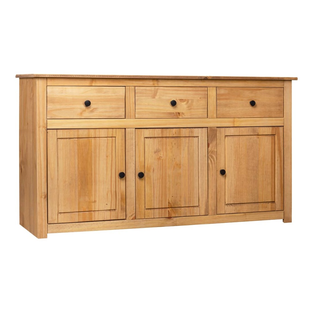 Introduisez un air d’élégance et de commodité dans votre intérieur avec notre buffet en bois massif ! Fabriquée en bois de pin massif, cette armoire à tiroirs est extrêmement durable et robuste. L'armoire latérale offre un grand espace de rangement avec 3 tiroirs et 3 compartiments. De plus, le dessus robuste est parfait pour exposer des objets décoratifs tels que des cadres photo, des plantes en pot, etc. Elle est facile à essuyer avec un chiffon sec. Le coffre de rangement est facile à assembler.