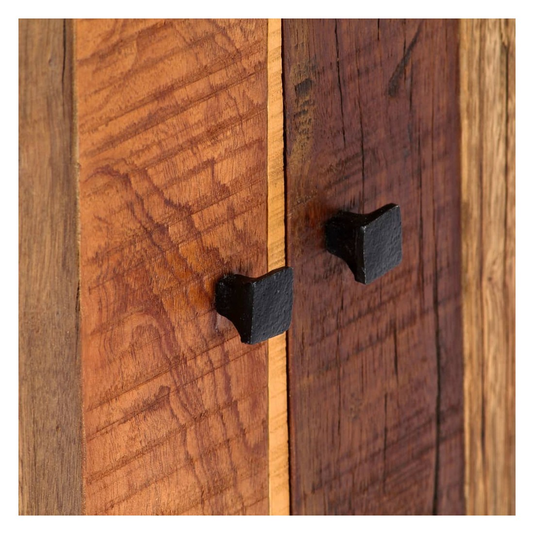Apportez une touche d'élégance du milieu du siècle à votre intérieur avec notre belle armoire latérale en bois de récupération massif ! Ce buffet est fait de bois massif de récupération provenant des solives, des planchers et des poutres de soutien de vieux bâtiments démolis et peut être composé de différentes essences de bois telles que le pin, le teck, le hêtre, le chêne, le cèdre, le bois de manguier, l'acacia, etc. Cela signifie que le bois de récupération conserve les caractéristiques de ces différents types de bois. Le bois de récupération est déjà vieilli, patiné et séché, donc il ne rétrécit pas et ne se plie pas. Chaque étape du processus est réalisée avec le plus grand soin, que ce soit le polissage, la peinture ou le laquage. L'artisanat exquis et les grains de bois gracieux rendent chaque meuble distinctif et légèrement différent l'un de l'autre. Cette armoire latérale se distingue par 2 portes et 1 étagère, offrant une solution idéale pour garder vos petits objets rangés et à portée de main. De plus, la structure en acier enduit de poudre ajoute à la robustesse et à la stabilité de l'armoire. L'armoire latérale est facile à assembler. Note importante : Les couleurs et les grains de bois varient d'une pièce à l'autre, ce qui rend chacune de nos armoires latérales unique. La livraison est aléatoire, ce qui garantit l'exclusivité et l'individualité de votre produit.