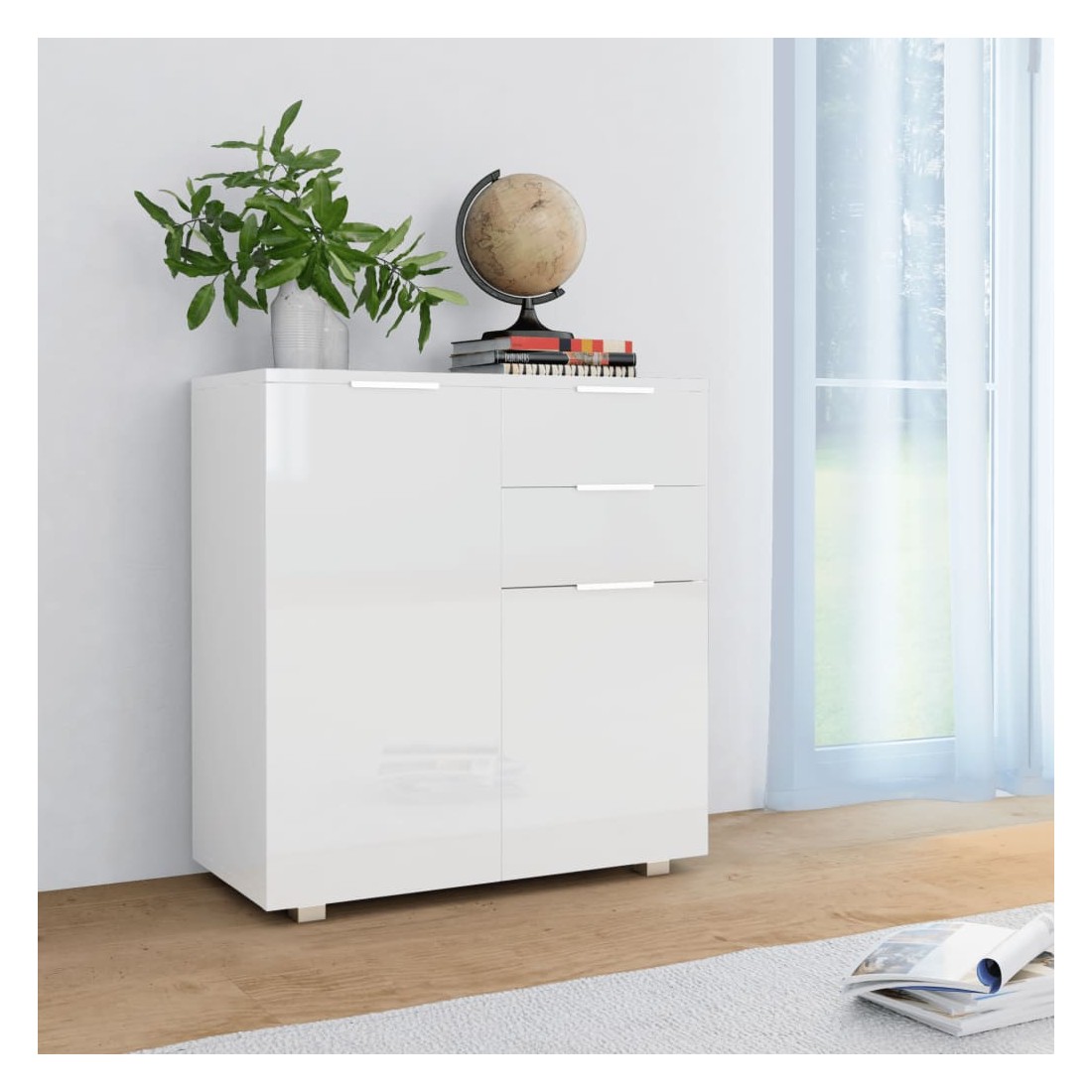 Avec son utilité pratique, le buffet deviendra le complément idéal dans votre chambre. Fabriqué en bois d'ingénierie avec une finition haute brillance, donnant à la commode un look raffiné et la rendant extrêmement stable et durable. De plus, équipé de 2 tiroirs et 2 portes, le buffet offre un grand espace de rangement pour vos divers objets, rendant votre pièce propre et bien rangée. Ce meuble de rangement haute brillance est facile à nettoyer.