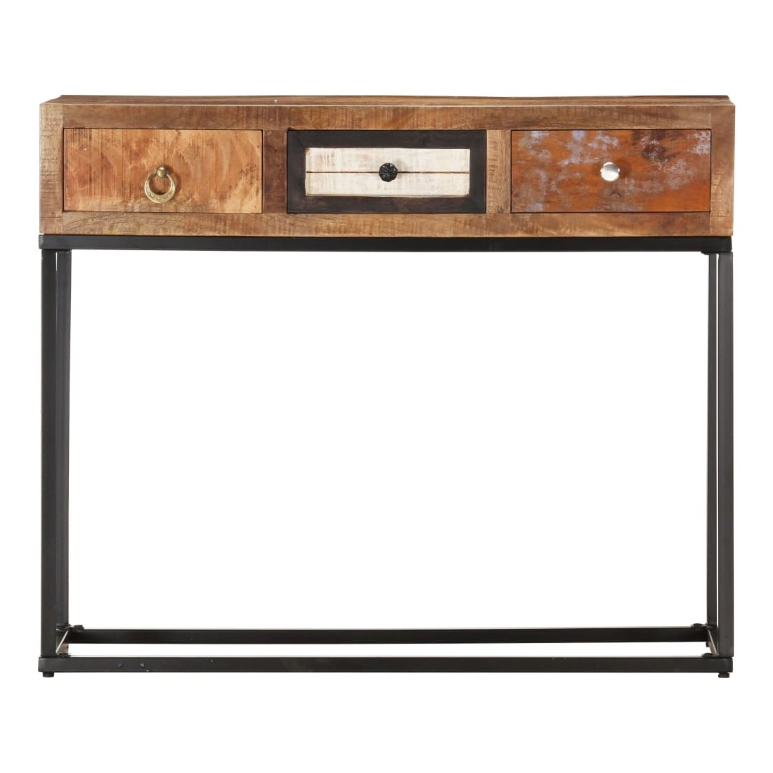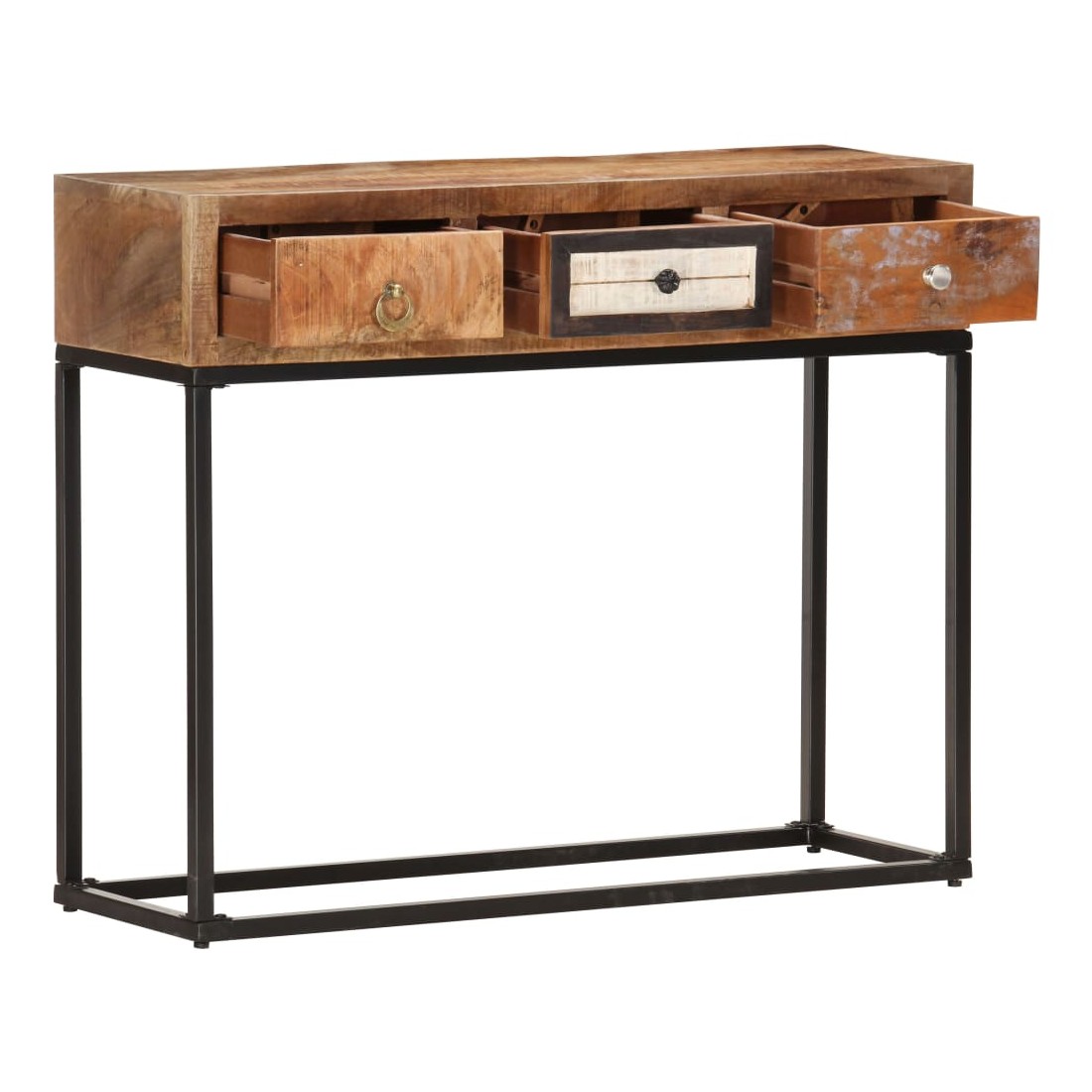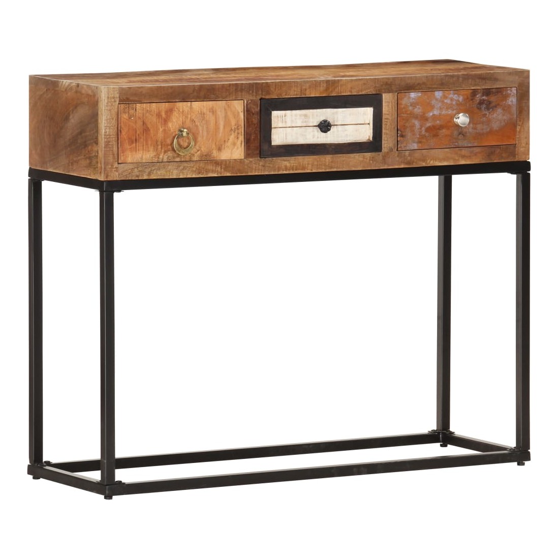 Notre table console en bois sera un supplément indémodable à votre décoration intérieure. La table est fabriquée en bois de récupération massif provenant des solives, des planchers et des poutres de soutènement d'anciens bâtiments étant démolis, et peut être composée de différents types de bois tels que le pin, le teck, le hêtre, le chêne, le cèdre, le manguier, l'acacia, etc. Cela signifie que le bois de récupération conserve les caractéristiques de ces différents types de bois. Le bois de récupération est déjà vieilli, patiné et séché, et par conséquent il ne rétrécit pas et ne se plie pas. Les fines veinures du bois rendent chaque meuble distinctif et légèrement différent l'un de l'autre. Le cadre en acier enduit de poudre ajoute au style industriel de la table d'entrée. De plus, elle a 3 tiroirs pour offrir un espace de rangement suffisant pour garder vos différents objets bien organisés. La table console est facile à assembler. Remarque importante : les couleurs peuvent varier d'une pièce à l'autre, ce qui rend chaque pièce unique et légèrement différente l'une de l'autre ; La livraison est aléatoire, ce qui garantit l'exclusivité et l'individualité de votre produit.