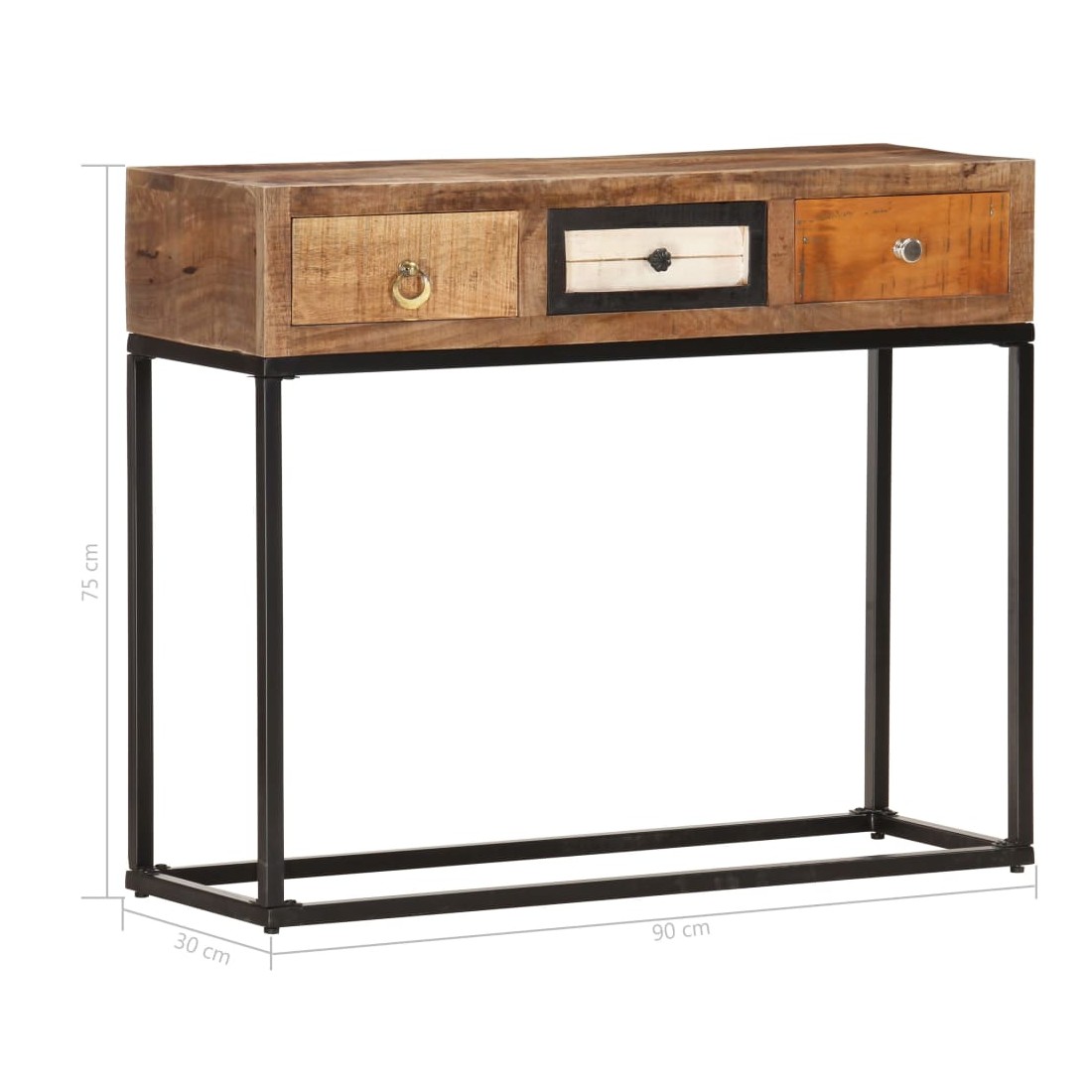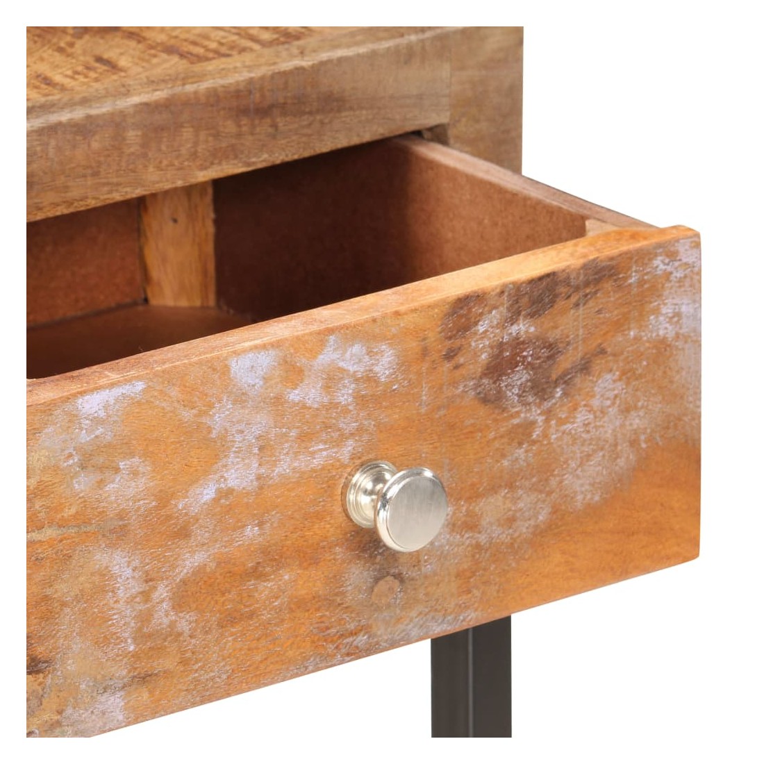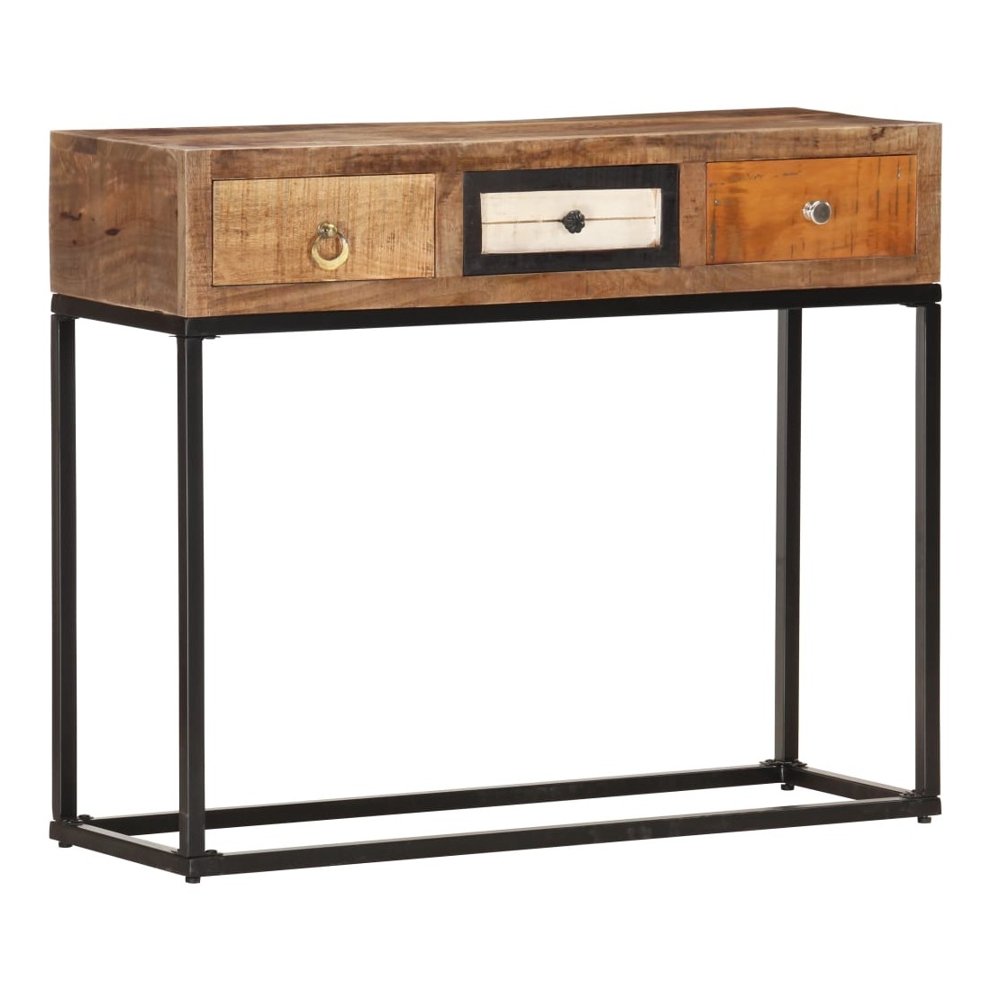 Notre table console en bois sera un supplément indémodable à votre décoration intérieure. La table est fabriquée en bois de récupération massif provenant des solives, des planchers et des poutres de soutènement d'anciens bâtiments étant démolis, et peut être composée de différents types de bois tels que le pin, le teck, le hêtre, le chêne, le cèdre, le manguier, l'acacia, etc. Cela signifie que le bois de récupération conserve les caractéristiques de ces différents types de bois. Le bois de récupération est déjà vieilli, patiné et séché, et par conséquent il ne rétrécit pas et ne se plie pas. Les fines veinures du bois rendent chaque meuble distinctif et légèrement différent l'un de l'autre. Le cadre en acier enduit de poudre ajoute au style industriel de la table d'entrée. De plus, elle a 3 tiroirs pour offrir un espace de rangement suffisant pour garder vos différents objets bien organisés. La table console est facile à assembler. Remarque importante : les couleurs peuvent varier d'une pièce à l'autre, ce qui rend chaque pièce unique et légèrement différente l'une de l'autre ; La livraison est aléatoire, ce qui garantit l'exclusivité et l'individualité de votre produit.