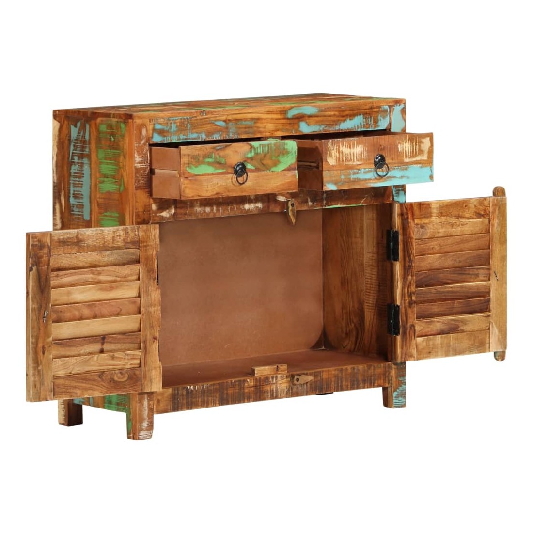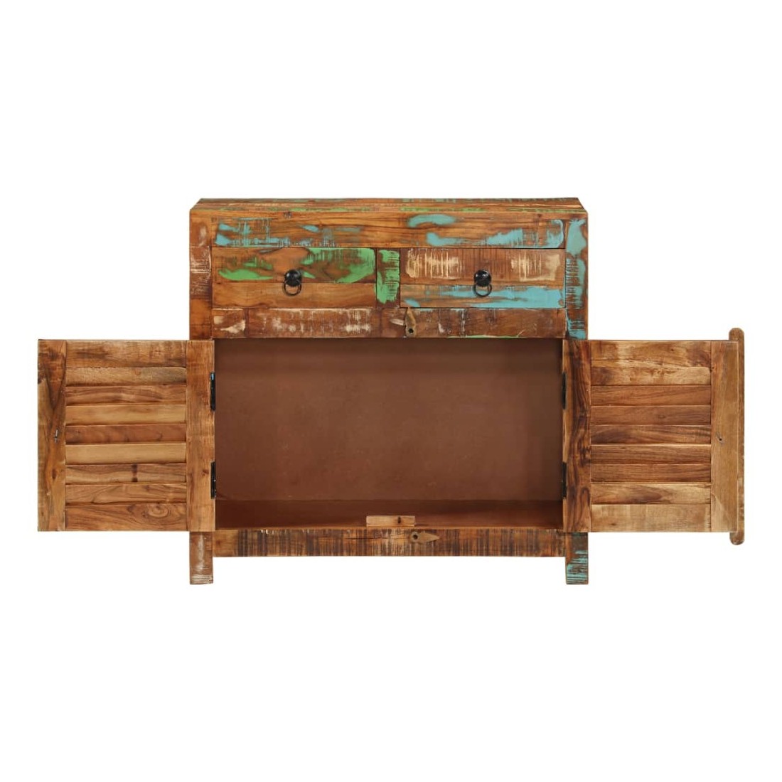 Ce buffet en bois sera un choix parfait si vous cherchez à ajouter une touche de charme rustique à votre décoration intérieure. Cette armoire de rangement est faite de bois de récupération solide qui a les caractéristiques de différents bois tels que le bois de manguier, le bois de teck, etc. Le dessus robuste est idéal pour afficher des cadres photo, des vases, des paniers de fruits ou d'autres objets décoratifs. Les 2 tiroirs et 2 portes offrent un grand espace de rangement, qui gardera vos articles à l'abri de la poussière et de l'encombrement hors de vue. Remarque importante : La couleur peut varier d'une pièce à l'autre, rendant chacun de nos buffets unique. La livraison est aléatoire, ce qui garantit l'exclusivité et l'individualité de votre produit.