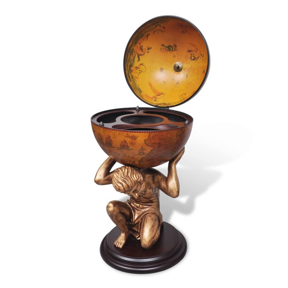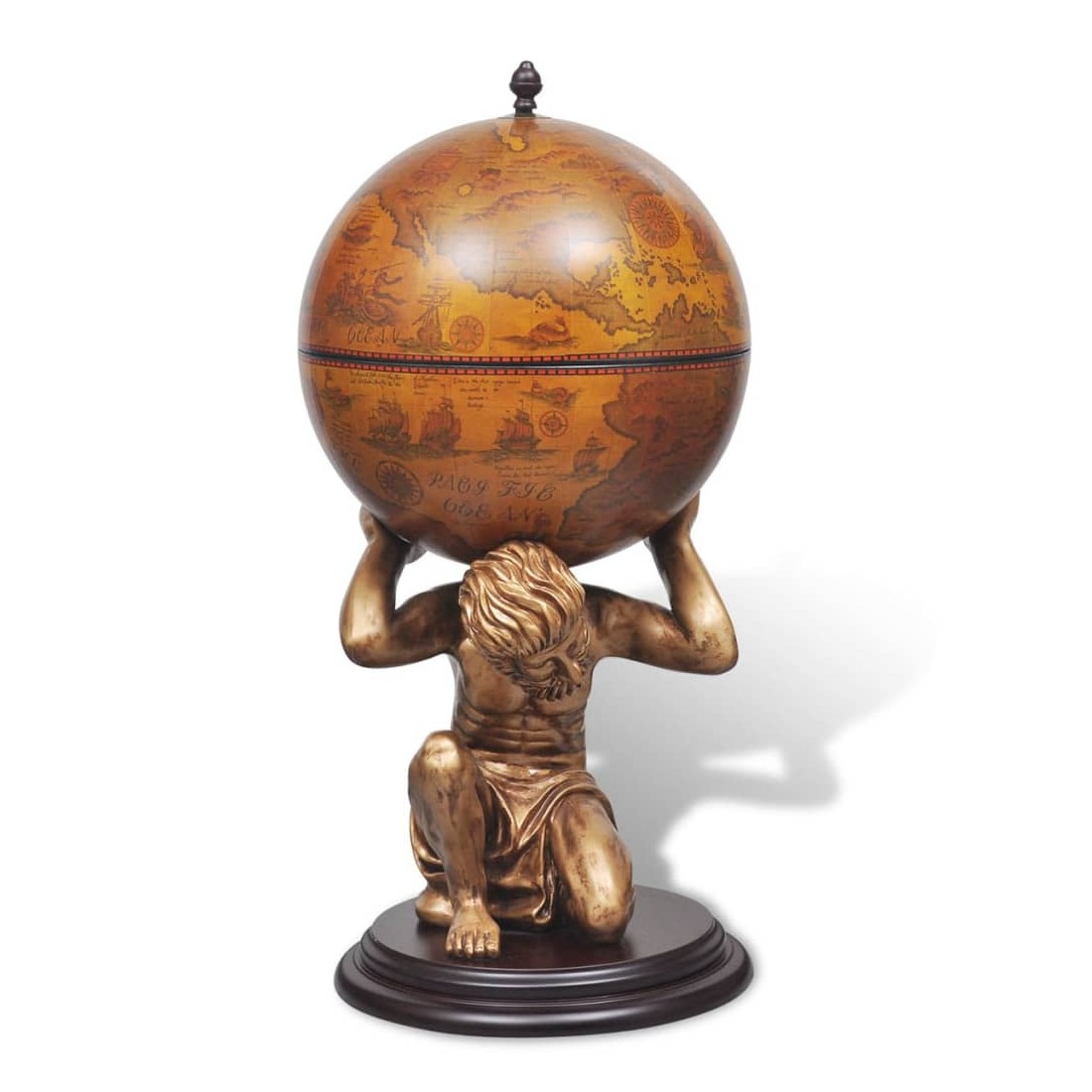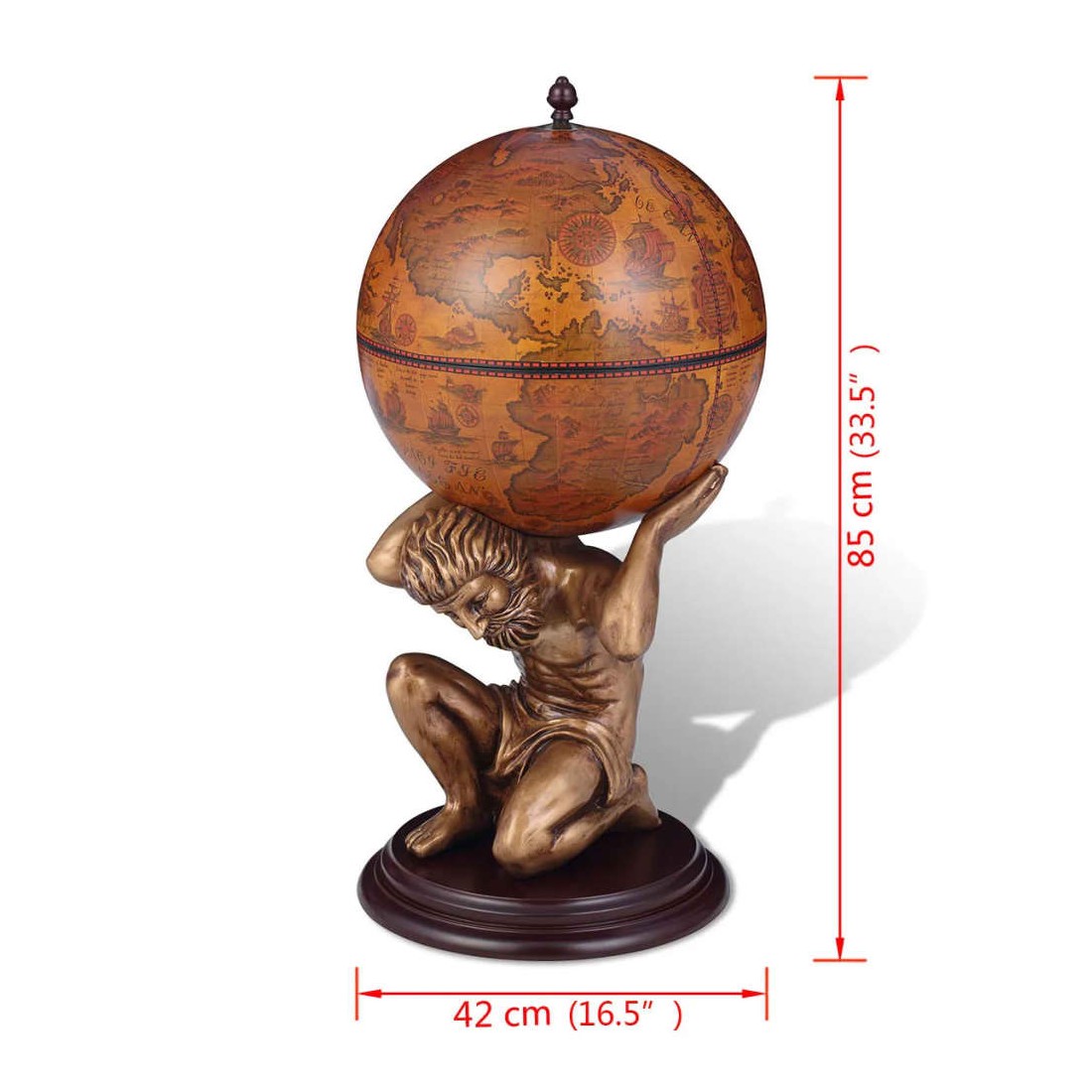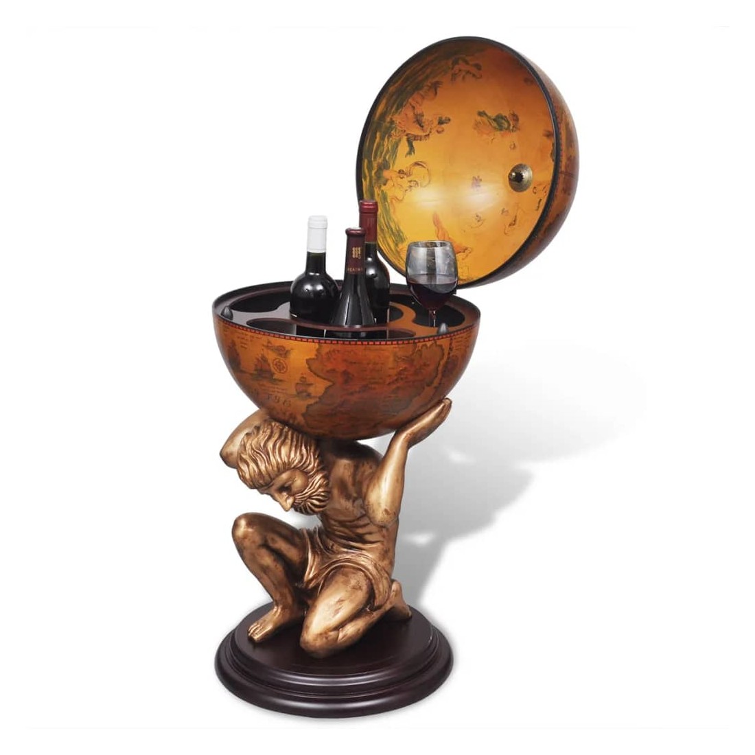 Étonnez vos quêtes avec votre sens du style en leur servant du vin et des spiritueux de ce bar sous forme de globe très décoratif ! Le bar sous forme de globe sera idéal pour stocker et organiser plusieurs bouteilles et verrerie. Le globe est orné d'un motif de carte à l'ancienne, tandis que la base stable, fabriquée à partir de MDF durable de haute qualité, a la forme de la figure mythologique Atlas. Ce globe / cette armoire à vin est une combinaison parfaite de praticité et d'esthétique. Veuillez noter que les spiritueux ne sont pas inclus dans la livraison.