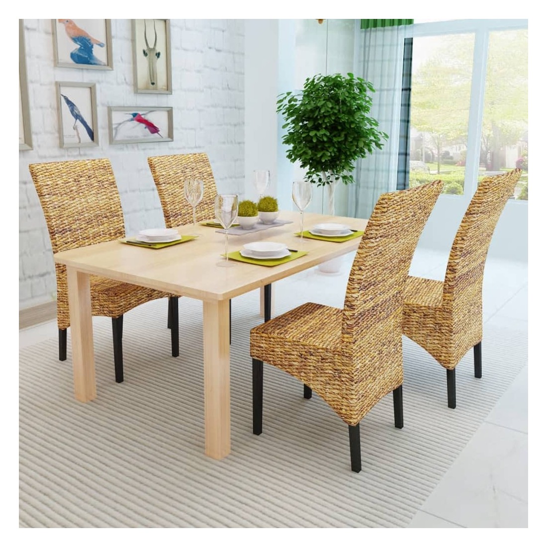 Il s'agit d'une ensemble de 4 chaises en fibres d'abaca tissées, faites à la main et de haute qualité. Grâce à leur style philippin, ces chaises en fibres d'abaca tissées seront un excellent ajout à votre intérieur. La structure en bois dur et les fibres d'abaca naturelles (feuilles de banane) rendent les chaises non seulement stables et robustes mais également agréables à l’œil. De plus, les sièges recouverts d'abaca sont très confortables. Si vous cherchez quelque chose pour compléter votre décor de cuisine ou de salle à manger, ces chaises habilement tissées sont un excellent choix. La livraison comprend 4 chaises. Veuillez noter : les chaises sont tissées à la main avec des fibres d'abaca naturelles, elles peuvent donc avoir des variations de couleur.