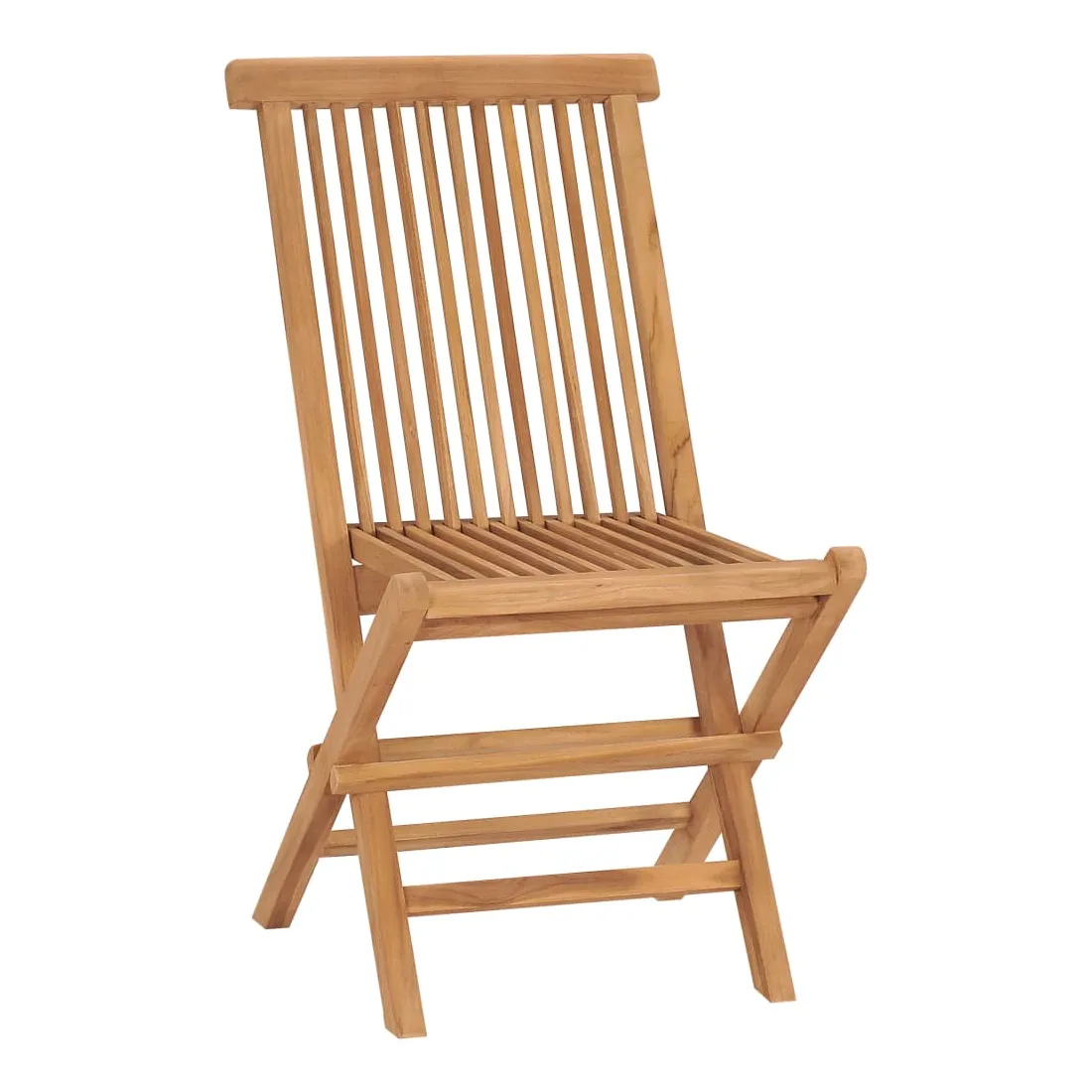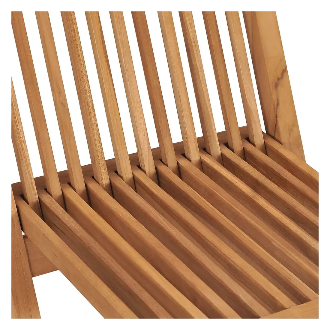 Cet ensemble de chaises de jardin, au design simple mais élégant, vous offre une expérience d'assise confortable. Construite à partir de bois dur de teck extrêmement durable, cette pièce de meuble en teck a été chevronnée, séchée au four puis poncée finement lui pour donner un aspect très lisse. Le bois de teck est connu pour sa solidité et sa résistance aux intempéries exceptionnelles, ce qui le rend bien plus adapté aux meubles de jardin que tout autre type de bois. Le bois de teck est le choix parfait si vous souhaitez acheter un meuble de jardin durable. De plus, les chaises en bois peuvent être facilement repliées lorsqu'elles ne sont pas utilisées. Remarque : afin de prolonger la durée de vie de vos meubles d'extérieur, nous vous recommandons de les nettoyer régulièrement et de ne pas les laisser à l'extérieur sans protection inutilement.Nettoyage : utiliser une solution savonneuse douceStockage : si possible, stockez dans un endroit frais et sec à l'intérieur. Si le produit est stocké à l'extérieur, protégez-le avec une housse imperméable. Essuyez et séchez l'excès d'eau ou de neige des surfaces planes après la pluie ou une chute de neige. Permettez une circulation d'air suffisante afin d'éviter les dommages liés à l'humidité.