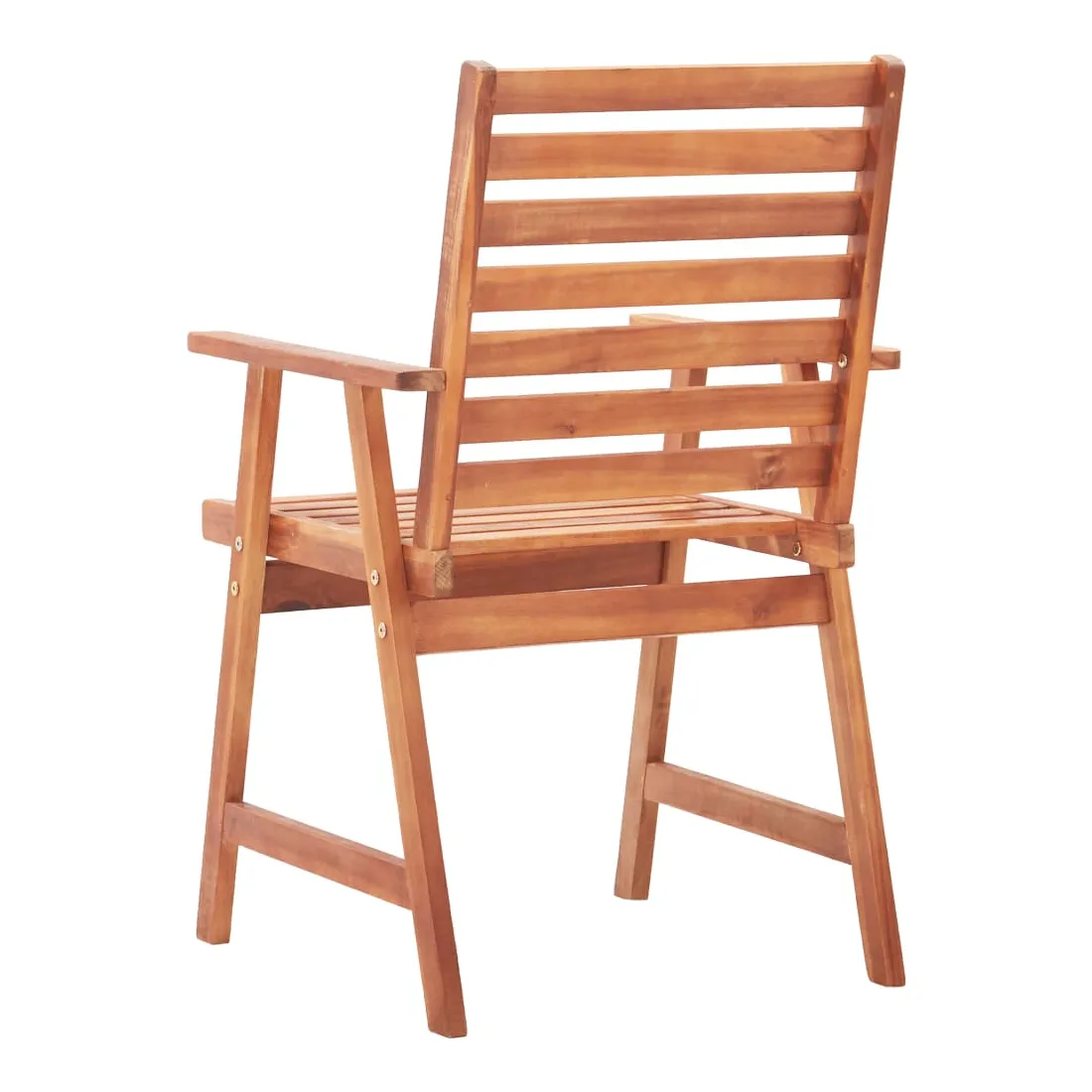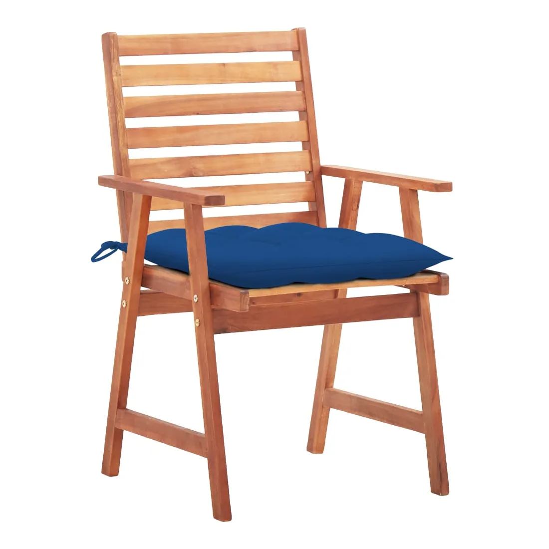 Cet ensemble de chaises de salle à manger contemporain en bois avec coussins ajoutera une touche de style naturel à votre jardin, terrasse ou patio. Cet ensemble de chaises en bois sera un excellent choix pour les repas en plein air. Ces chaises de jardin sont fabriquées en bois d'acacia massif, un bois dur tropical, résistant aux intempéries et durable pendant des années. La surface finie à l'huile est facile à nettoyer avec un chiffon humide. La conception à lattes apportera un charme rustique. De plus, les coussins inclus offrent du confort supplémentaire lors de l'assise. Il est composé à 100 % de polyester qui a été traité pour le rendre imperméable. Chaque coussin a deux jeux de cordes pour le fixer fermement sur la chaise.