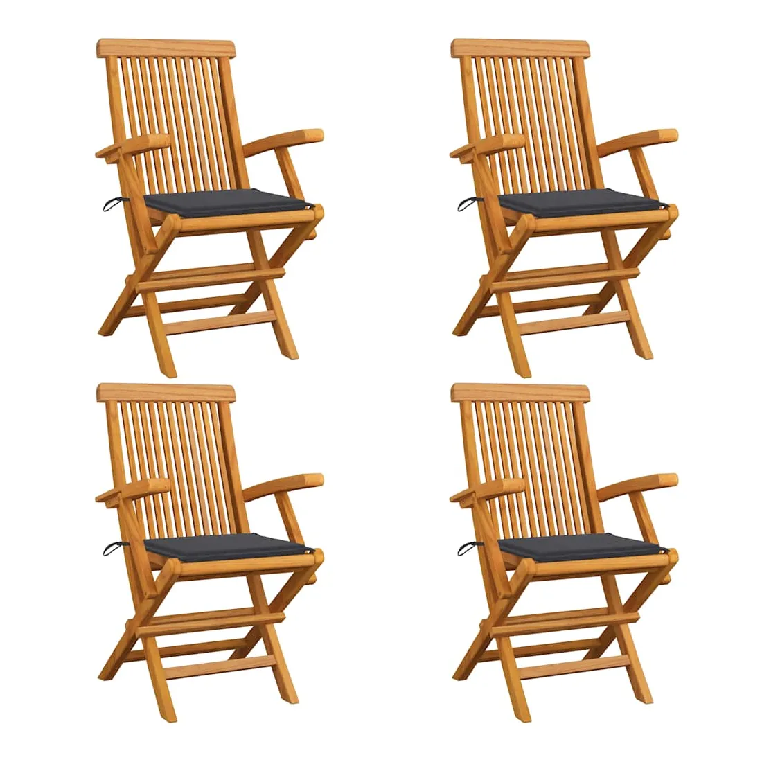Cet ensemble de chaises de jardin en bois se compose de 4 pièces et est destiné à être un excellent supplément à votre jardin, terrasse ou patio. Vous pouvez vous détendre et discuter avec la famille et les amis ou profiter du bon temps. Fabriquée en bois dur de teck extrêmement durable, cette pièce de meuble en teck a été chevronnée, séchée au four puis finement poncée pour lui donner un aspect très lisse. Le bois de teck est connu pour sa résistance exceptionnelle aux intempéries, ce qui le rend bien plus adapté aux meubles de jardin que tout autre type de bois. Le bois de teck est le choix idéal si vous souhaitez acheter une pièce de meubles de jardin durable. La surface poncée est facile à nettoyer avec un chiffon humide. Ces chaises d'extérieur sont également légères, ce qui les rend complètement flexibles et faciles à déplacer. Les chaises en bois peuvent être pliées pour gagner de la place lorsqu'elles ne sont pas utilisées. De plus, les coussins de siège inclus offrent également un confort d'assise supplémentaire.