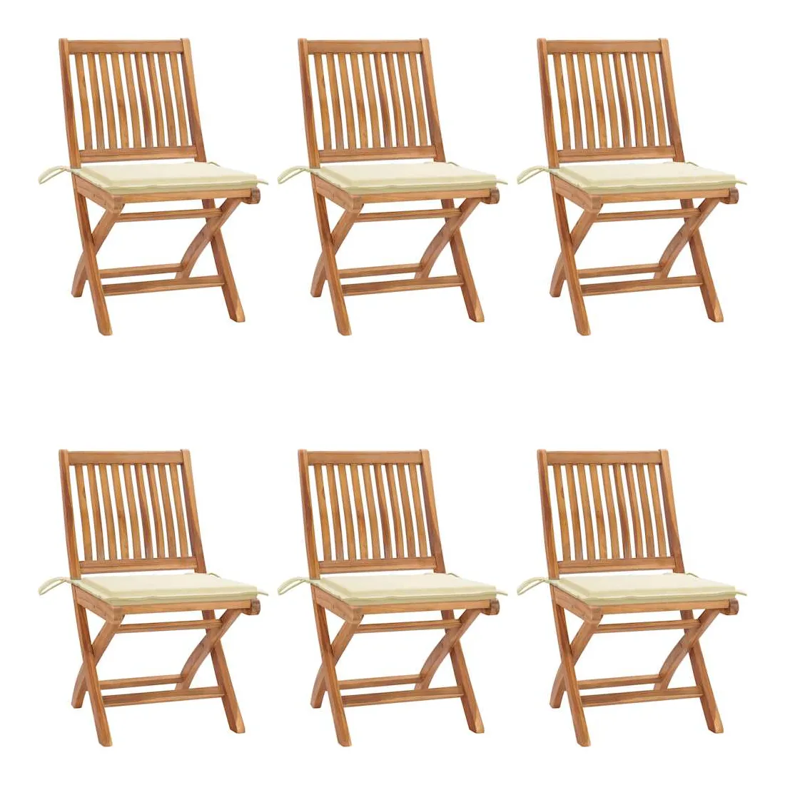 Cet ensemble de chaises de jardin en bois présente un design intemporel. Les chaises d’extérieur conviennent à tous les environnements, tels que les maisons, les bureaux, les bars et les cafés, grâce à leur design simple mais élégant. Fabriqué en bois dur de teck extrêmement durable, cet ensemble de meubles en teck a été chevronné, séché au four puis finement poncé pour lui donner un aspect très lisse. Le bois de teck est connu pour sa résistance exceptionnelle aux intempéries, ce qui le rend bien plus adapté aux meubles de jardin que tout autre type de bois. Le bois de teck est le choix idéal si vous souhaitez acheter un meuble de jardin durable. Grâce à la surface sablée, les chaises de salle à manger sont résistantes aux intempéries et faciles à nettoyer. Elles peuvent également être pliées pour économiser de l’espace de stockage lorsqu'elles ne sont pas utilisées. De plus, les coussins fournis offrent un confort supplémentaire. Chaque coussin dispose de 2 ensembles de cordes pour le fixer solidement sur la chaise. Remarque : afin de prolonger la durée de vie de vos meubles d'extérieur, nous vous recommandons de les nettoyer régulièrement et de ne pas les laisser à l'extérieur sans protection inutilement.Nettoyage : utiliser une solution savonneuse douceStockage : si possible, stockez dans un endroit frais et sec à l'intérieur. Si le produit est stocké à l'extérieur, protégez-le avec une housse imperméable. Essuyez et séchez l'excès d'eau ou de neige des surfaces planes après la pluie ou une chute de neige. Permettez une circulation d'air suffisante afin d'éviter les dommages liés à l'humidité.
