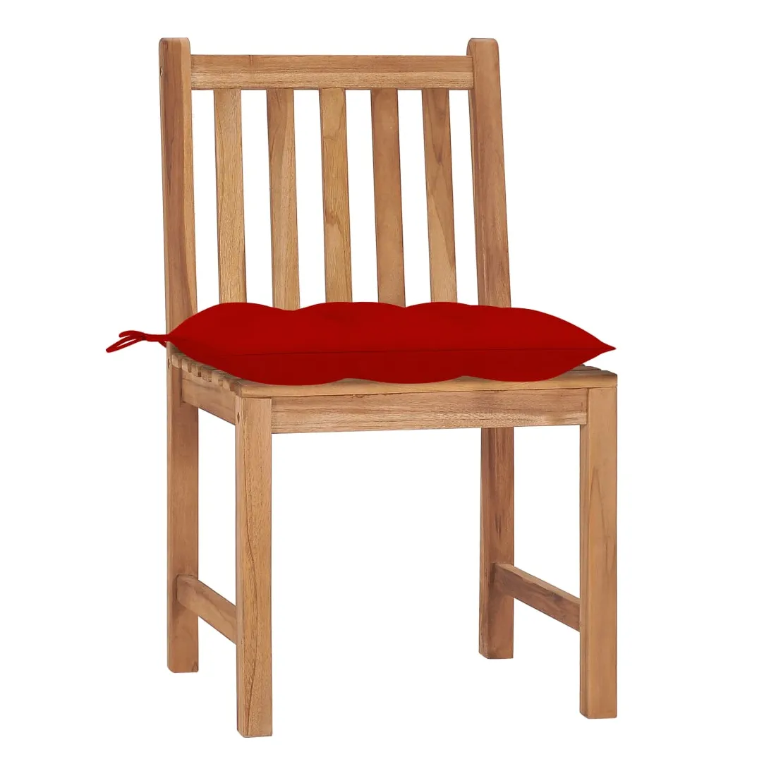 Cet ensemble de chaises de jardin en bois robuste sera un endroit idéal pour vous détendre et profiter du soleil dans votre jardin ou patio. Fabriquée en bois dur de teck extrêmement durable, cette pièce de meuble en teck a été chevronnée, séchée au four puis finement poncée pour lui donner un aspect très lisse. Le bois de teck est connu pour sa résistance exceptionnelle aux intempéries, ce qui le rend bien plus adapté aux meubles de jardin que tout autre type de bois. Le bois de teck est le choix idéal si vous souhaitez acheter un meuble de jardin durable. Une belle finition à base d’eau est appliquée pour donner au bois une couleur chaude. Les chaises d’extérieur stables disposent d’un aspect raffiné qui peut instantanément se fondre dans n’importe quel espace de vie. Le coussin inclus est pratique et a une fonction décorative. Remarque : Afin de prolonger la durée de vie de vos meubles d'extérieur, nous vous recommandons de les nettoyer régulièrement et de ne pas les laisser à l'extérieur sans protection inutilement.Nettoyage : Utiliser une solution savonneuse douceStockage : Si possible, stockez dans un endroit frais et sec à l'intérieur. Si le produit est stocké à l'extérieur, protégez-le avec une housse imperméable. Essuyez et séchez l'excès d'eau ou de neige des surfaces planes après la pluie ou une chute de neige. Permettez une circulation d'air suffisante afin d'éviter les dommages liés à l'humidité.