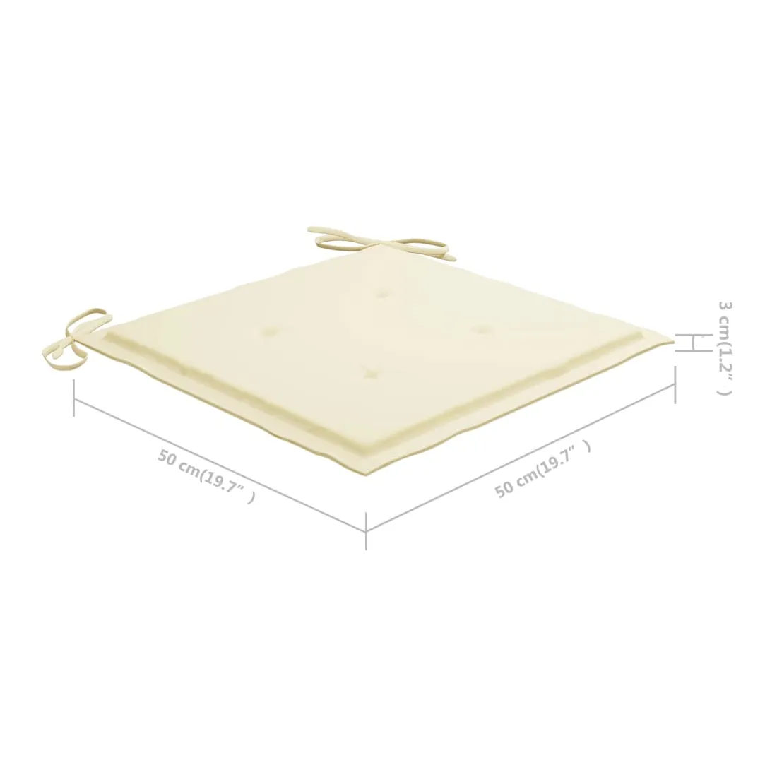 Ajoutez une touche de charme rustique à votre salle à manger, jardin ou terrasse avec cet ensemble de chaises de jardin empilables avec ensemble de coussins ! La chaise de salle à manger élève votre espace de vie intérieur ou extérieur à un niveau supérieur avec un design à lattes et élégant. Cet ensemble de meubles en teck est fabriqué à partir de bois dur de teck extrêmement durable et est chevronné, séché au four et poncé finement pour lui donner un aspect très lisse. Le bois de teck est connu pour sa solidité et sa résistance aux intempéries exceptionnelles, ce qui le rend bien plus adapté aux meubles de jardin que tout autre type de bois. Le bois de teck est le choix parfait si vous souhaitez acheter un meuble de jardin durable. Il est facile à entretenir et à nettoyer avec un chiffon humide. De plus, la chaise de salle à manger peut être empilée pour économiser de l'espace de stockage lorsqu'elle n'est pas utilisée. De plus, les coussins inclus offrent un confort supplémentaire. Chaque coussin a 2 jeux de cordes pour le fixer fermement sur la chaise. Remarque : afin de prolonger la durée de vie de vos meubles d'extérieur, nous vous recommandons de les nettoyer régulièrement et de ne pas les laisser à l'extérieur sans protection inutilement.Nettoyage : utiliser une solution savonneuse douceStockage : si possible, stockez dans un endroit frais et sec à l'intérieur. Si le produit est stocké à l'extérieur, protégez-le avec une housse imperméable. Essuyez et séchez l'excès d'eau ou de neige des surfaces planes après la pluie ou une chute de neige. Permettez une circulation d'air suffisante afin d'éviter les dommages liés à l'humidité.