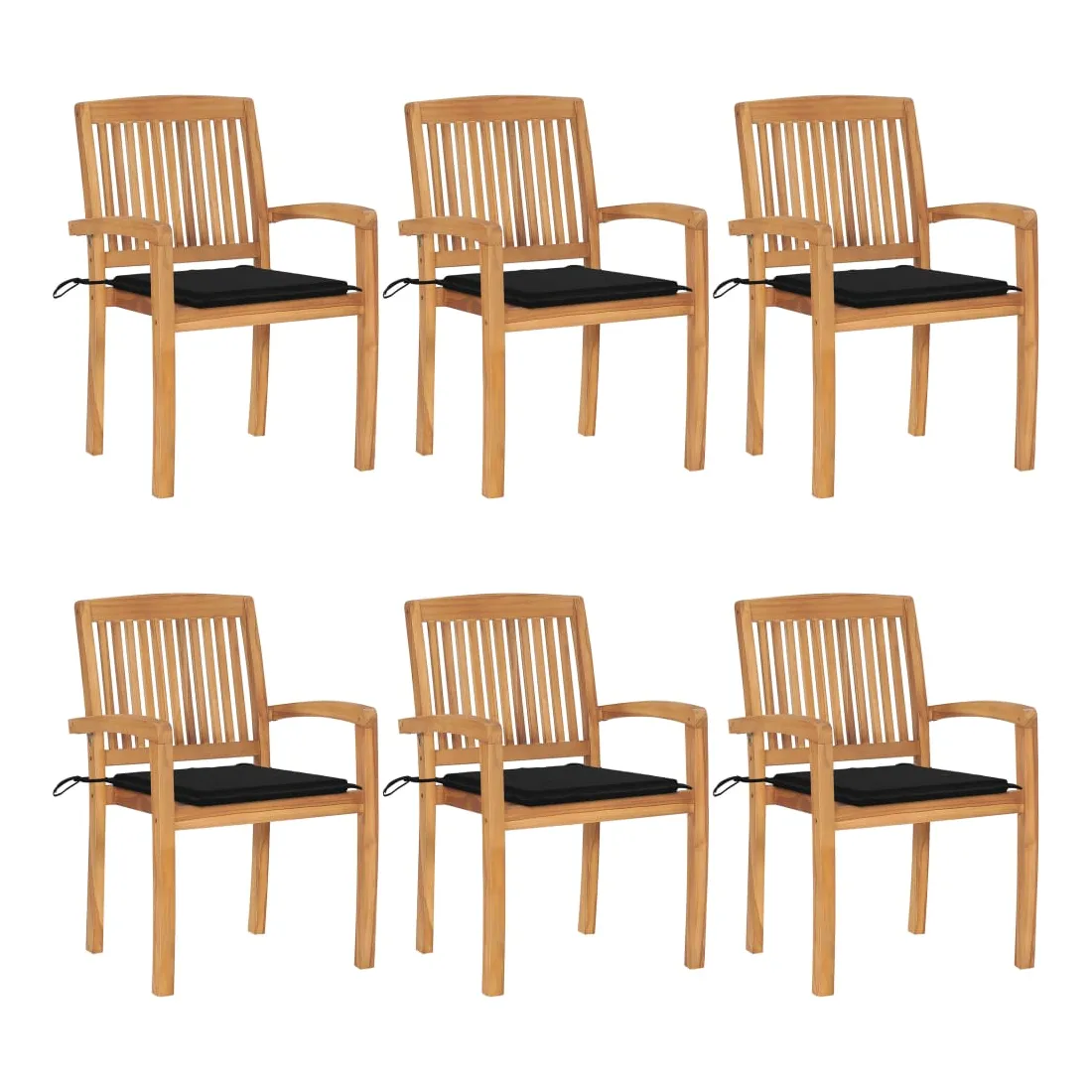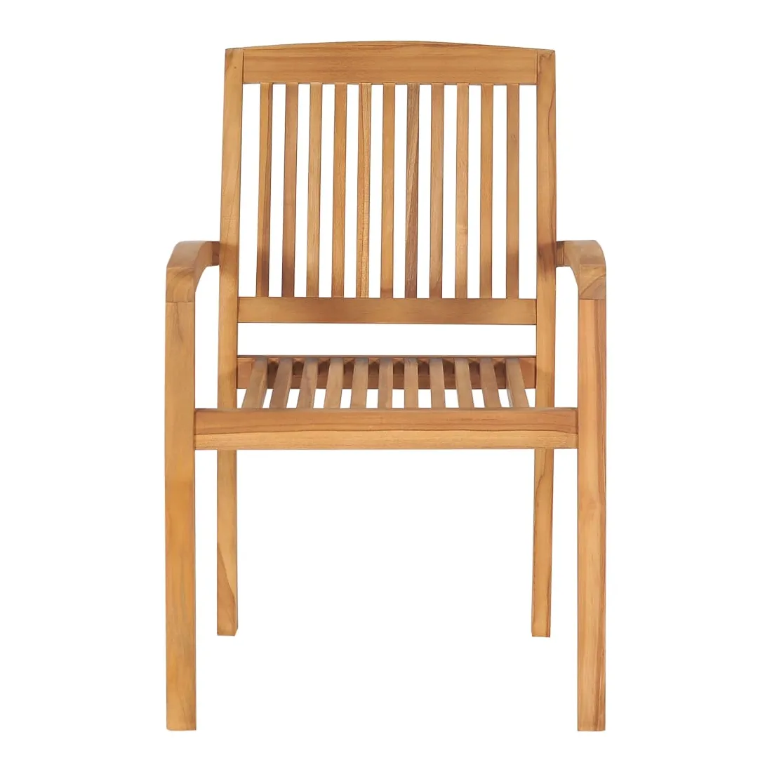 Ajoutez une touche de charme rustique à votre salle à manger, jardin ou terrasse avec cet ensemble de chaises de jardin empilables avec ensemble de coussins ! La chaise de salle à manger élève votre espace de vie intérieur ou extérieur à un niveau supérieur avec un design à lattes et élégant. Cet ensemble de meubles en teck est fabriqué à partir de bois dur de teck extrêmement durable et est chevronné, séché au four et poncé finement pour lui donner un aspect très lisse. Le bois de teck est connu pour sa solidité et sa résistance aux intempéries exceptionnelles, ce qui le rend bien plus adapté aux meubles de jardin que tout autre type de bois. Le bois de teck est le choix parfait si vous souhaitez acheter un meuble de jardin durable. Il est facile à entretenir et à nettoyer avec un chiffon humide. De plus, la chaise de salle à manger peut être empilée pour économiser de l'espace de stockage lorsqu'elle n'est pas utilisée. De plus, les coussins inclus offrent un confort supplémentaire. Chaque coussin a 2 jeux de cordes pour le fixer fermement sur la chaise. Remarque : afin de prolonger la durée de vie de vos meubles d'extérieur, nous vous recommandons de les nettoyer régulièrement et de ne pas les laisser à l'extérieur sans protection inutilement.Nettoyage : utiliser une solution savonneuse douceStockage : si possible, stockez dans un endroit frais et sec à l'intérieur. Si le produit est stocké à l'extérieur, protégez-le avec une housse imperméable. Essuyez et séchez l'excès d'eau ou de neige des surfaces planes après la pluie ou une chute de neige. Permettez une circulation d'air suffisante afin d'éviter les dommages liés à l'humidité.