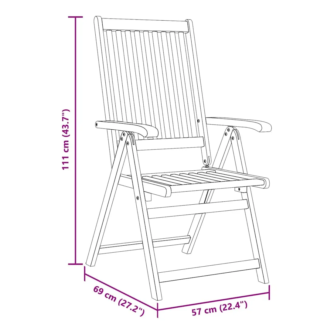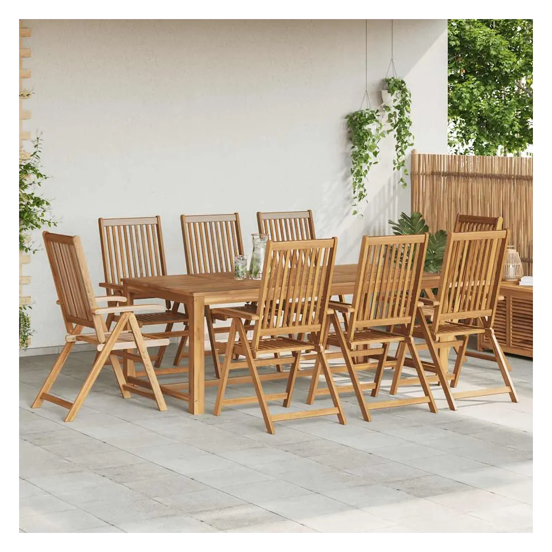 Cet ensemble de chaises de jardin en bois est conçu pour ajouter un look vintage à tout dîner dans votre jardin, sur votre terrasse ou patio. La chaise pliable est fabriquée en bois d’acacia massif, un bois dur tropical, ce qui la rend stable et durable. La surface à finition à l'huile est facile à nettoyer avec un chiffon humide. La chaise de salle à manger peut être réglée à 5 positions, vous offrant un confort d’assise optimal. Elle peut également être pliée pour économiser de l’espace lorsqu'elle n’est pas utilisée. Remarque : afin de prolonger la durée de vie de vos meubles d'extérieur, nous vous recommandons de les nettoyer régulièrement et de ne pas les laisser à l'extérieur sans protection inutilement.Nettoyage : utiliser une solution savonneuse douceStockage : si possible, stockez dans un endroit frais et sec à l'intérieur. Si le produit est stocké à l'extérieur, protégez-le avec une housse imperméable. Essuyez et séchez l'excès d'eau ou de neige des surfaces planes après la pluie ou une chute de neige. Permettez une circulation d'air suffisante afin d'éviter les dommages liés à l'humidité.