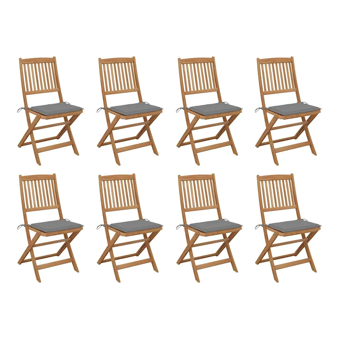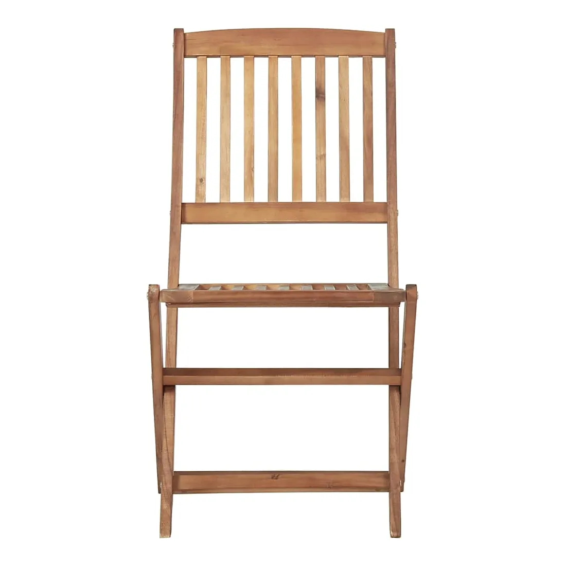 Cet ensemble de chaises de salle à manger contemporain en bois ajoutera une touche de style naturel à votre jardin, terrasse ou patio. Cet ensemble de chaises pliables sera un excellent choix pour les repas en plein air. Ces chaises de salle à manger sont construites en bois d'acacia de qualité supérieure, un bois tropical, qui est résistant aux intempéries et durable pour des années d'utilisation. La surface à finition à l'huile est également facile à nettoyer avec un chiffon humide. Les chaises peuvent être pliées pour économiser de l'espace lorsqu'elles ne sont pas utilisées. De plus, les coussins fournis offrent un confort supplémentaire. Chaque coussin dispose de 2 ensembles de cordes pour le fixer fermement sur la chaise. Remarque : afin de prolonger la durée de vie de vos meubles d'extérieur, nous vous recommandons de les nettoyer régulièrement et de ne pas les laisser à l'extérieur sans protection inutilement.Nettoyage : utiliser une solution savonneuse douceStockage : si possible, stockez dans un endroit frais et sec à l'intérieur. Si le produit est stocké à l'extérieur, protégez-le avec une housse imperméable. Essuyez et séchez l'excès d'eau ou de neige des surfaces planes après la pluie ou une chute de neige. Permettez une circulation d'air suffisante afin d'éviter les dommages liés à l'humidité.