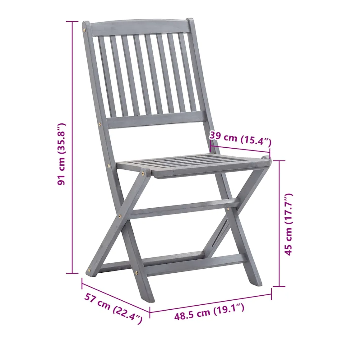 Cet ensemble de chaises de salle à manger en bois contemporain avec coussins ajoute une touche de style naturel à votre jardin, terrasse ou patio. Cet ensemble de chaises pliables est un excellent choix pour les repas. Ces chaises de salle à manger sont faites de bois d’acacia massif, un bois dur tropical, les rendant résistantes aux intempéries et durables pour des années d’utilisation. Le bois d’acacia massif a la force de soutenir le poids et de résister à l’usure du temps. La surface grise délavée est facile à nettoyer avec un chiffon humide. Les chaises peuvent être repliées pour économiser de l’espace lorsqu'elles ne sont pas utilisées. De plus, les coussins inclus offrent un confort supplémentaire lors des moments de détente ou des repas. Chaque coussin comporte deux ensembles de cordes pour le fixer fermement à la chaise. Remarque : Afin de prolonger la durée de vie de vos meubles d'extérieur, nous vous recommandons de les nettoyer régulièrement et de ne pas les laisser à l'extérieur sans protection inutilement.Nettoyage : Utiliser une solution savonneuse douceStockage : Si possible, stockez dans un endroit frais et sec à l'intérieur. Si le produit est stocké à l'extérieur, protégez-le avec une housse imperméable. Essuyez et séchez l'excès d'eau ou de neige des surfaces planes après la pluie ou une chute de neige. Permettez une circulation d'air suffisante afin d'éviter les dommages liés à l'humidité.