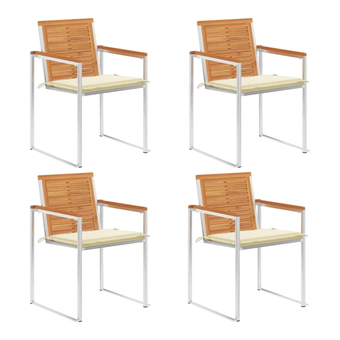 Ces chaises de jardin en bois sont conçues pour devenir le point de mire de votre jardin ou de votre patio. Les chaises de salle à manger sont fabriquées en bois d'acacia massif et en acier inoxydable de haute qualité, ce qui les rend très durables, résistantes à la rouille, robustes et faciles à nettoyer avec un chiffon humide. Le coussin inclus est plus qu'un supplément pratique, il a également une fonction décorative. Asseyez-vous pour un délicieux dîner en plein air ou détendez-vous et profitez du beau temps avec cet ensemble classique de chaises de jardin. Remarque : afin de prolonger la durée de vie de vos meubles d'extérieur, nous vous recommandons de les nettoyer régulièrement et de ne pas les laisser à l'extérieur sans protection inutilement.Nettoyage : Utiliser une solution savonneuse douce.Stockage : si possible, stockez dans un endroit frais et sec à l'intérieur. Si le produit est stocké à l'extérieur, protégez-le avec une housse imperméable. Essuyez et séchez l'excès d'eau ou de neige des surfaces planes après la pluie ou une chute de neige. Permettez une circulation d'air suffisante afin d'éviter les dommages liés à l'humidité.