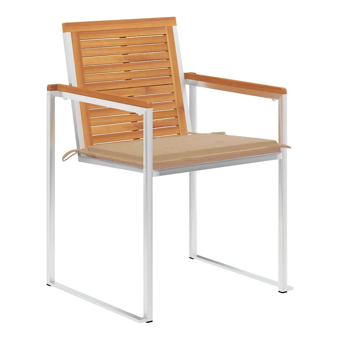 Ces chaises de jardin en bois sont conçues pour devenir le point de mire de votre jardin ou de votre patio. Les chaises de salle à manger sont fabriquées en bois d'acacia massif et en acier inoxydable de haute qualité, ce qui les rend très durables, résistantes à la rouille, robustes et faciles à nettoyer avec un chiffon humide. Le coussin inclus est plus qu'un supplément pratique, il a également une fonction décorative. Asseyez-vous pour un délicieux dîner en plein air ou détendez-vous et profitez du beau temps avec cet ensemble classique de chaises de jardin. Remarque : afin de prolonger la durée de vie de vos meubles d'extérieur, nous vous recommandons de les nettoyer régulièrement et de ne pas les laisser à l'extérieur sans protection inutilement.Nettoyage : Utiliser une solution savonneuse douce.Stockage : si possible, stockez dans un endroit frais et sec à l'intérieur. Si le produit est stocké à l'extérieur, protégez-le avec une housse imperméable. Essuyez et séchez l'excès d'eau ou de neige des surfaces planes après la pluie ou une chute de neige. Permettez une circulation d'air suffisante afin d'éviter les dommages liés à l'humidité.