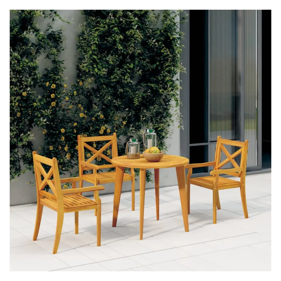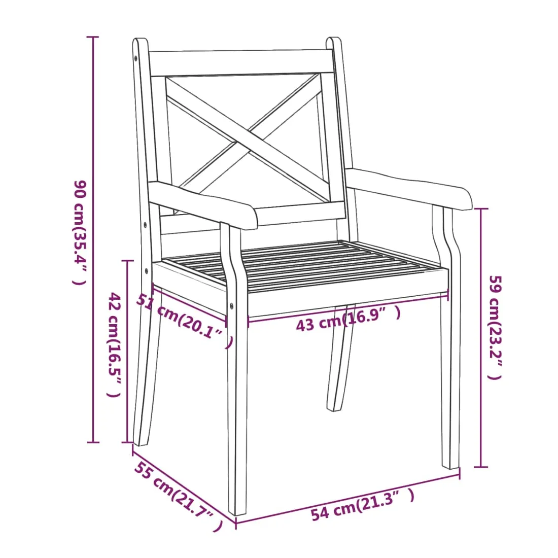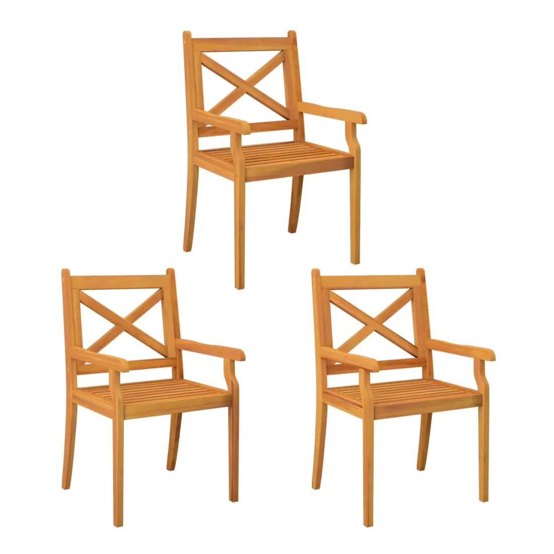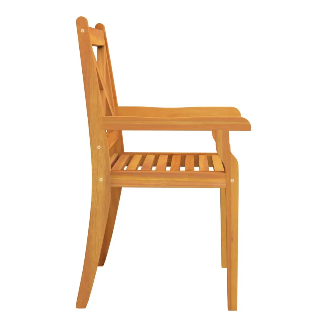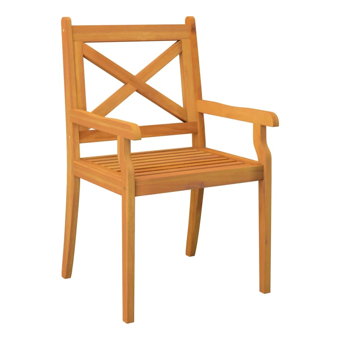 Ces chaises de salle à manger d'extérieur en bois sont sans aucun doute un excellent choix pour les repas en plein air dans votre jardin et sur votre terrasse. Bois d'acacia massif : le bois d'acacia massif est un matériau naturel magnifique. Le bois d'acacia un bois dur tropical, qui est dense, robuste et durable.Accoudoirs pratiques : les accoudoirs de ces chaises de salle à manger ajoutent plus de confort en position assise.Design élégant : ces chaises, avec un design en croix du dossier et un design à lattes du siège, sont conçues pour être au centre de votre espace. Remarque :Afin de prolonger la durée de vie de votre mobilier d'extérieur, nous vous recommandons de le protéger avec une housse imperméable.