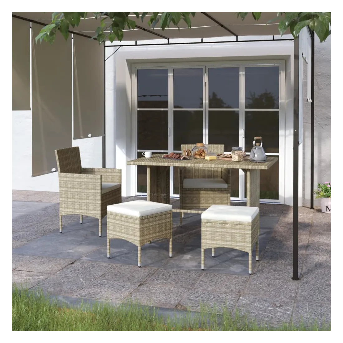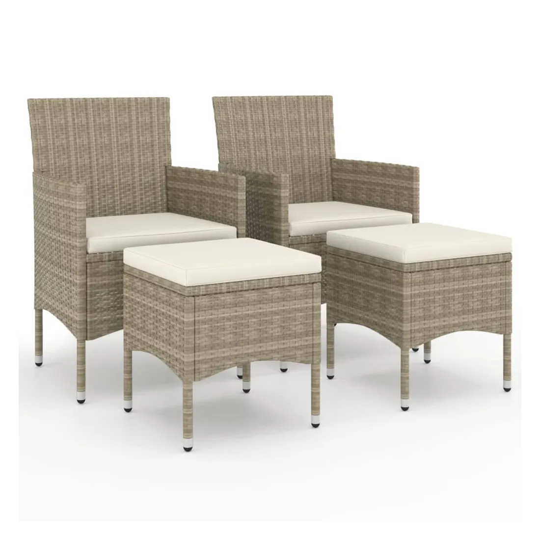 Cet ensemble de 4 chaises et tabourets de jardin complète parfaitement votre jardin, terrasse et espace de vie extérieur. Les meubles de jardin sont fabriqués à partir d’un solide cadre en acier enduit de poudre, ce qui la rend robuste et stable pour des années de détente. L'ensemble de chaises et de tabourets d'extérieur recouvert de résine tressée est facile à nettoyer avec un chiffon humide et convient à une utilisation quotidienne à l’extérieur. De plus, le coussin d'assise bien rembourré ajoute un confort supplémentaire à la chaise. Remarque : afin de prolonger la durée de vie de vos meubles d'extérieur, nous vous recommandons de les nettoyer régulièrement et de ne pas les laisser à l'extérieur sans protection inutilement.Nettoyage : Utiliser une solution savonneuse douce.Stockage : si possible, stockez dans un endroit frais et sec à l'intérieur. Si le produit est stocké à l'extérieur, protégez-le avec une housse imperméable. Essuyez et séchez l'excès d'eau ou de neige des surfaces planes après la pluie ou une chute de neige. Permettez une circulation d'air suffisante afin d'éviter les dommages liés à l'humidité.