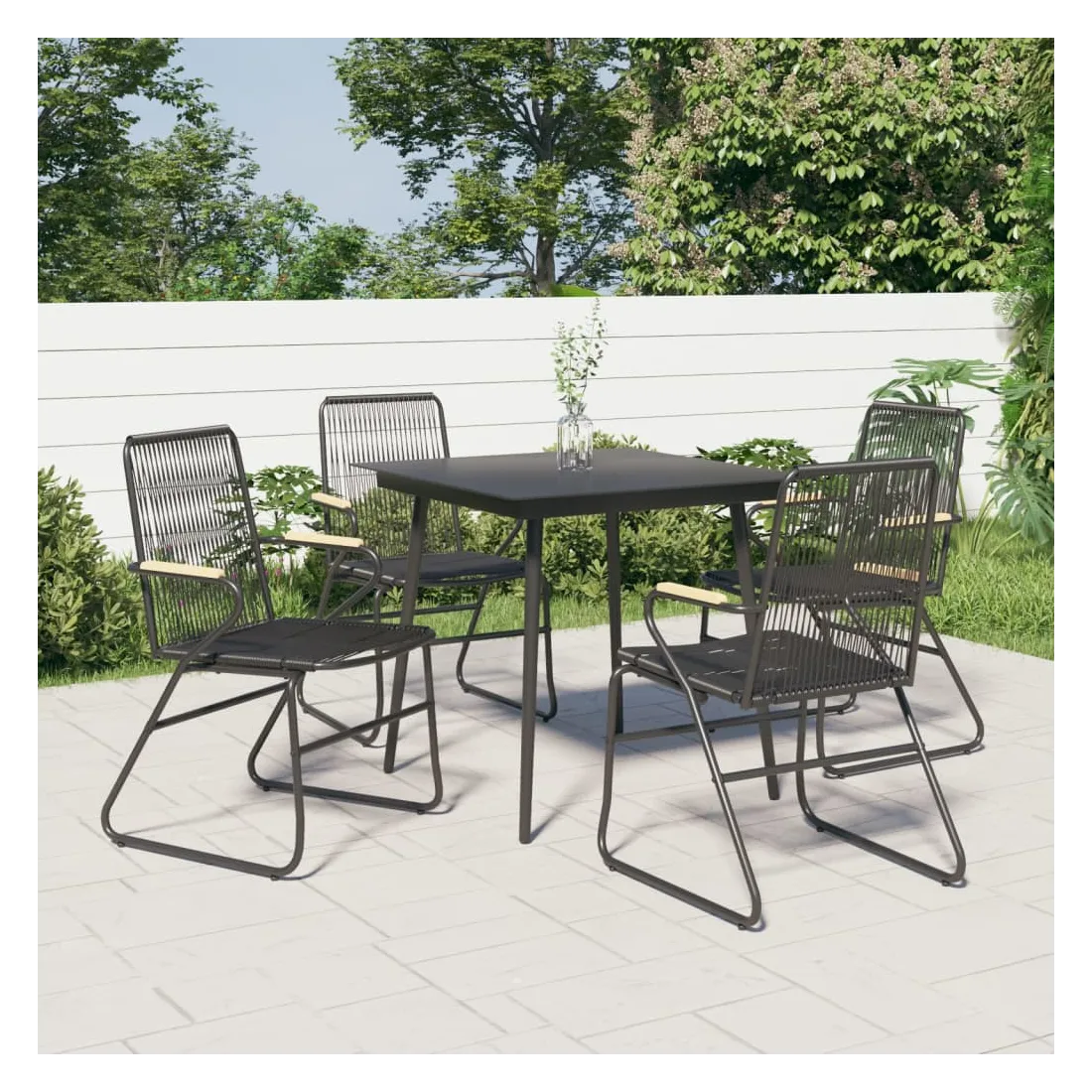 - Matériau : rotin PVC, acier enduit de poudre, bois de teck massif