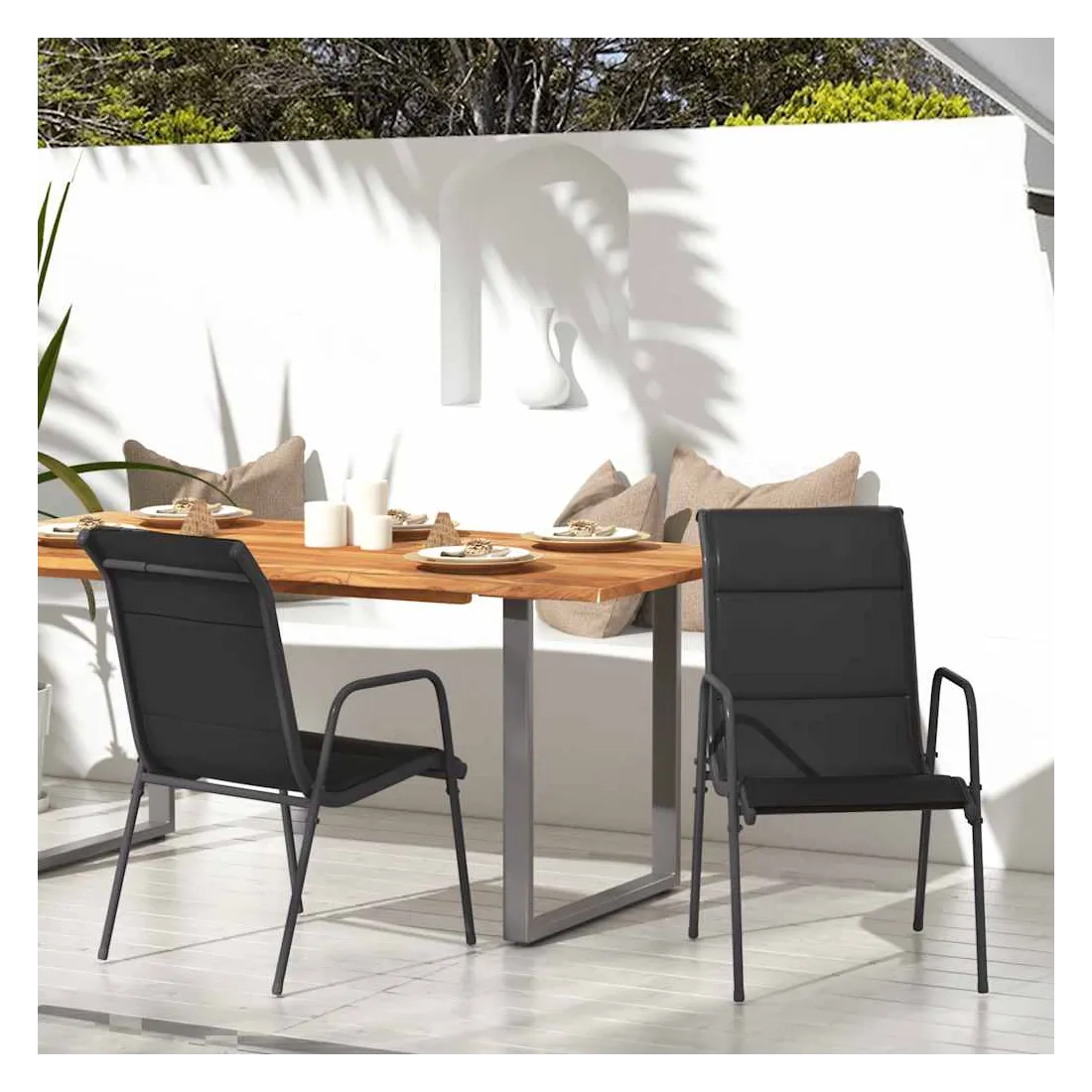 Ces chaises de jardin confortables sont excellentes pour dîner, lire et vous détendre avec votre famille et vos amis dans votre espace extérieur. Cadre robuste et stable : ces fauteuils confortables sont fabriqués en acier enduit de poudre, ce qui les rend robustes et stables.Matériau haut de gamme : grâce au tissu textilène résistant avec rembourrage, ces chaises d'extérieur sont très confortables, résistantes aux intempéries et faciles à nettoyer.Design léger : grâce à leur structure légère, ces chaises sont faciles à déplacer ou à transporter au camping, à la plage, etc. Remarque :Afin de prolonger la durée de vie de votre mobilier d'extérieur, nous vous recommandons de le protéger avec une housse imperméable.