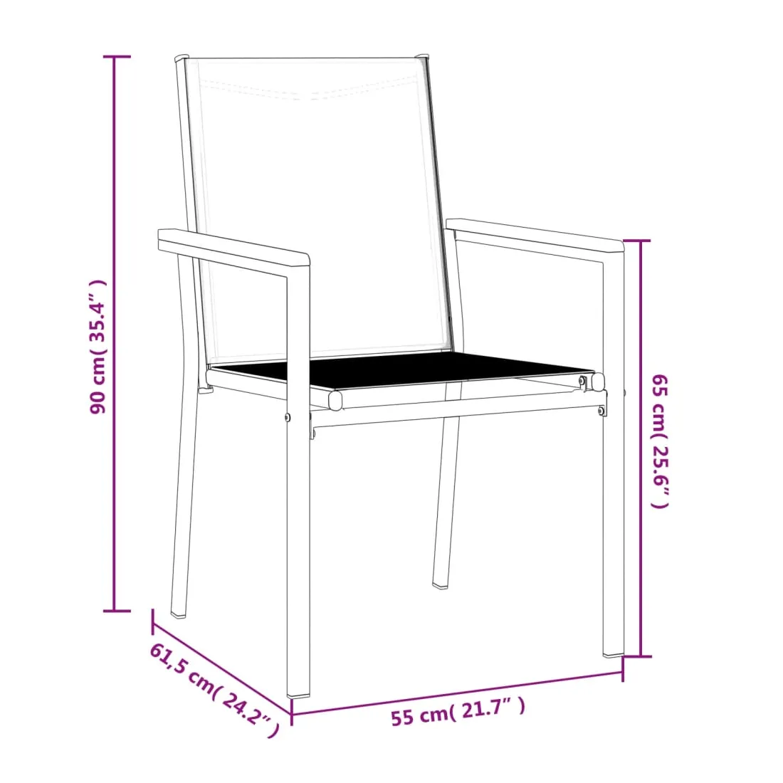 Ces chaises de jardin élégantes sont un complément parfait à votre jardin et à votre terrasse, créant une impression durable ! Matériau durable : le tissu en textilène permet à l'air de circuler librement à travers lui tout en étant résistant aux rayons UV. Le textilène est donc idéal pour les temps chauds. En tant que matériau durable et solide, il est très résistant aux déchirures, aux perforations et aux moisissures.Cadre robuste : le cadre en acier rend les chaises de jardin robustes et stables pour une utilisation quotidienne à l'extérieur.Expérience d'assise confortable : le dossier et les accoudoirs ajoutent un confort d'assise supplémentaire à la chaise d'extérieur. Bon à savoir :Pour que vos meubles d'extérieur restent beaux, nous vous recommandons de les protéger avec une housse imperméable.
