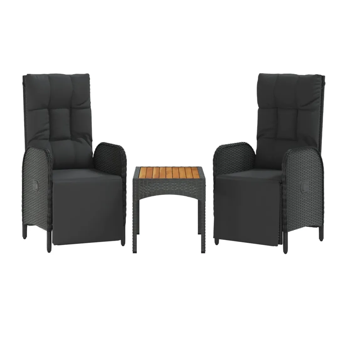 Ces chaises inclinables de jardin avec une table sont un complément parfait à votre jardin et à votre terrasse, créant une impression durable ! Matériau haut de gamme : la résine tressée est un matériau de résistance exceptionnelle et durable dans différentes conditions météorologiques.Table pratique : la table de jardin avec un dessus de table en bois d'acacia massif est parfait pour placer des boissons, des aliments et des décorations. Il a une belle apparence et est facile à nettoyer.Fonction d'inclinaison : les chaises de jardin sont spécialement conçues avec une fonction d'inclinaison afin que vous puissiez régler le dossier et le repose-pied selon votre confort.Expérience d'assise confortable : des coussins supplémentaires sont inclus pour votre confort. Le coussin d'assise et le coussin de dossier peuvent être reliés par une fermeture éclair pour plus de commodité. Remarque :Afin de prolonger la durée de vie de votre mobilier d'extérieur, nous vous recommandons de le protéger avec une housse imperméable.Chaque produit est livré avec un manuel de montage dans la boîte pour un montage facile.