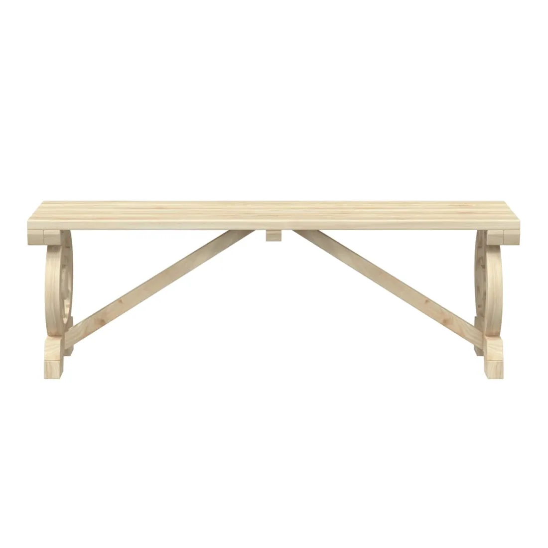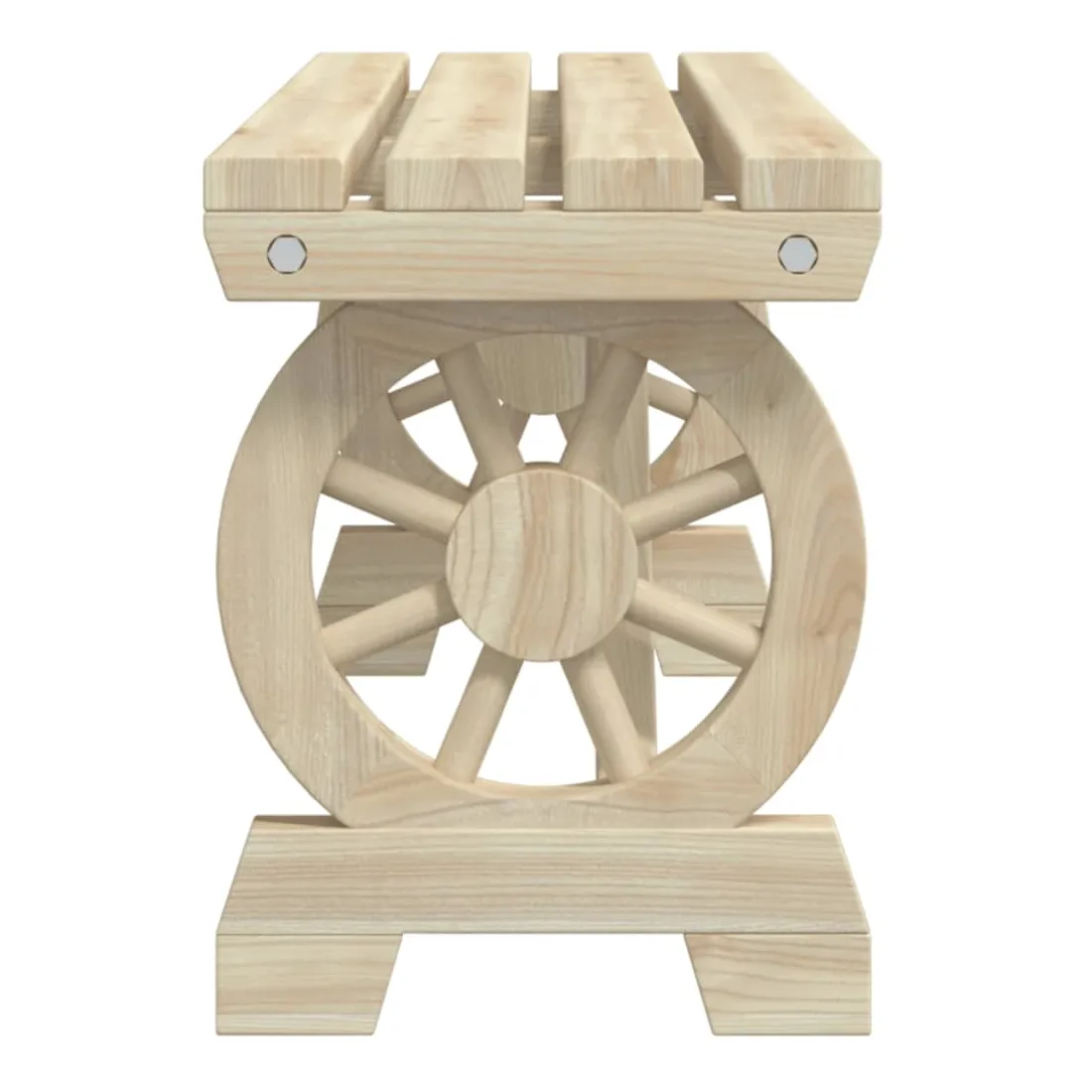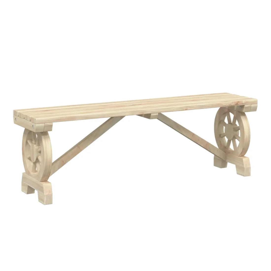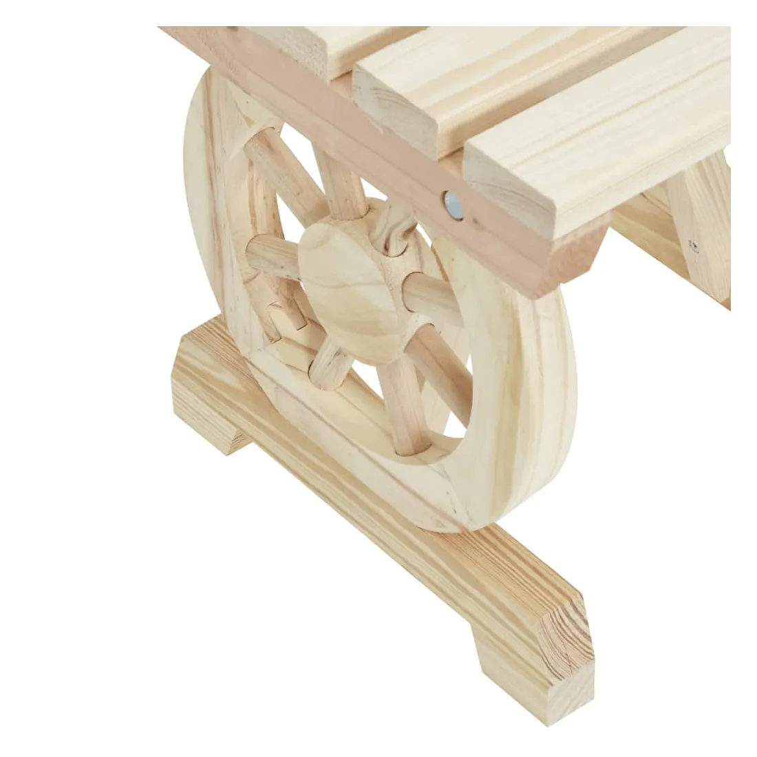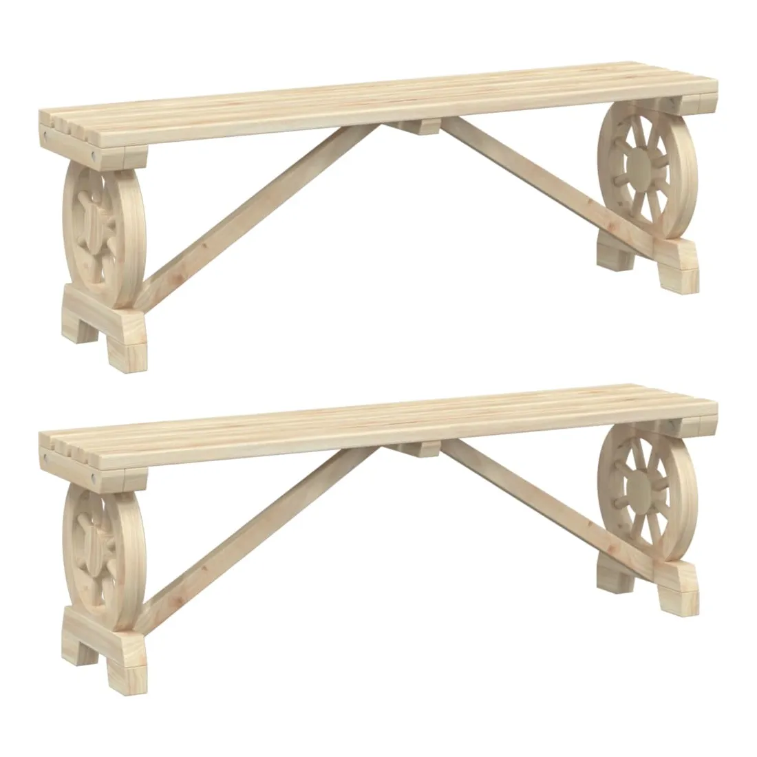 Ces bancs de jardin en bois seront un excellent ajout à votre jardin, patio ou terrasse, vous permettant de passer des moments agréables avec votre famille ou vos amis. Bois de sapin massif : le bois de sapin massif est un matériau beau et durable qui conserve son intégrité même lorsqu'il est exposé à l'humidité. Il ne sèche pas et ne se déforme pas, ce qui en fait un choix fiable.Cadre robuste : le cadre en bois assure robustesse et stabilité.Design attrayant : le banc d’extérieur présent un design en forme de roue de chariot qui offre un affichage accrocheur sous tous les angles. Bon à savoir :Pour que vos meubles d'extérieur restent beaux, nous vous recommandons de les protéger avec une housse imperméable.