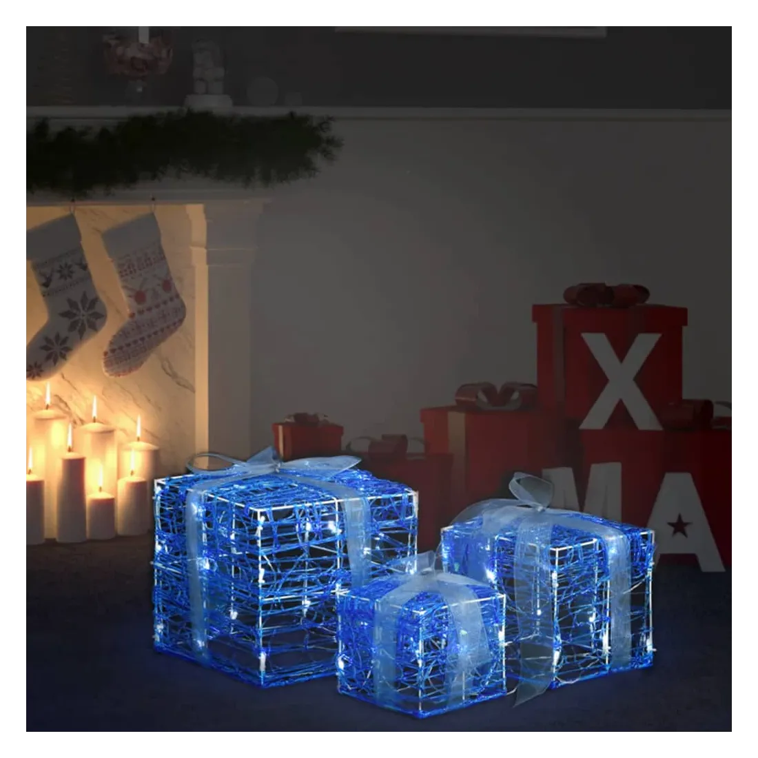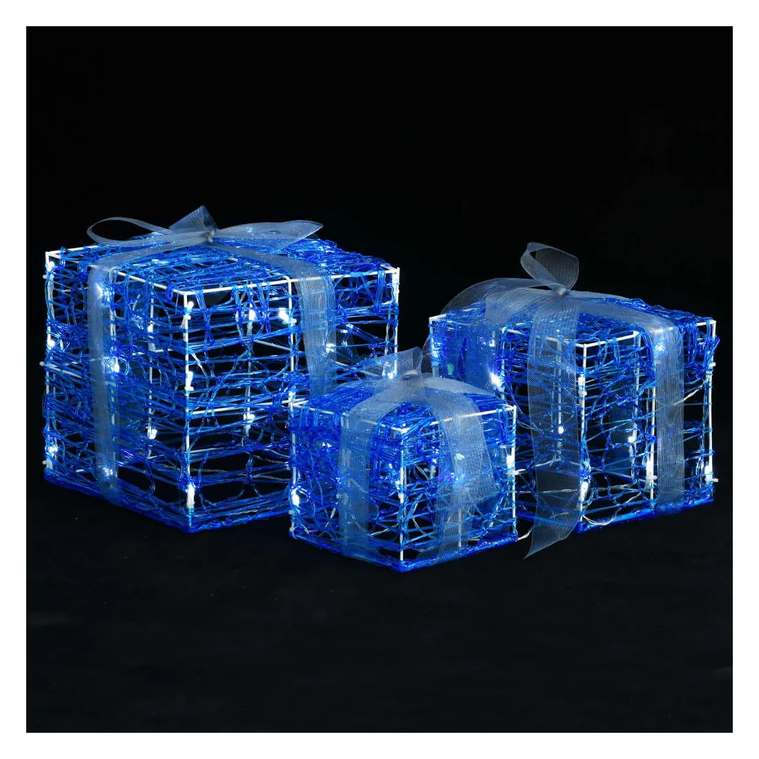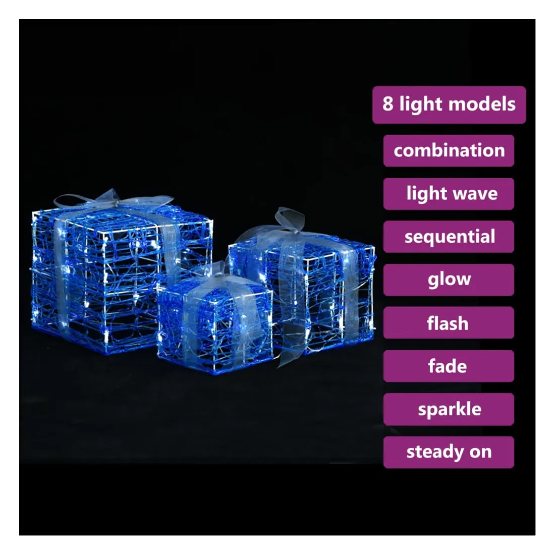 Créez une touche d'éclat dans votre maison de Noël avec ces boîtes-cadeaux ! Ces boîtes lumineuses sont fabriquées en acrylique fort et brillant. La boîte de Noël dispose de 48 lumières LED, qui sont économes en énergie et durables. Conçues avec 8 effets lumineux différents : une combinaison de tous les effets, éclairage lent, scintillement/clignotement, en vague, poursuite/ruissellement de l'eau, séquentiel, allumage permanent et atténuation lente, elle s'illumine magnifiquement et crée une ambiance de vacances magique. Grâce à la conception empilable, elle est facile et pratique à ranger. Le beau nœud est amovible. De plus, le boîtier de piles est étanche, de sorte que ces boîtes-cadeaux de Noël puissent être utilisées à l'extérieur.