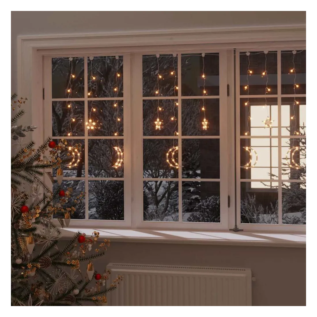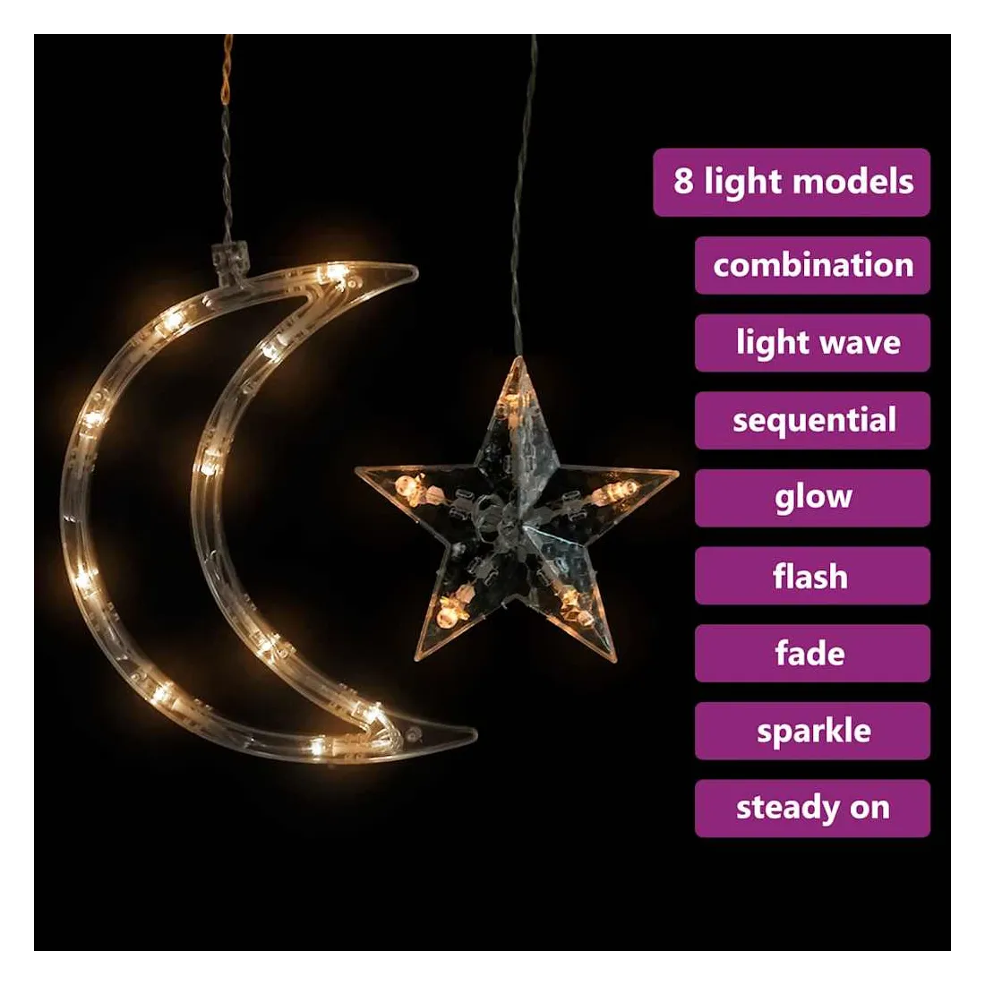 La guirlande lumineuse d'étoile et de lune est parfaite pour une utilisation comme un complément d’éclairage à tout projet décoratif. Elle est adaptée pour Noël, fêtes, mariages et autres jours fériés. Le rideau lumineux est équipé de 138 LED à économie d'énergie, créant une performance d'éclairage magique. Il dispose de 8 effets d'éclairage différents : mode combiné, vagues, mode séquentiel, mode de lumière lente, clignotant, mode d'atténuation lente, scintillement et éclairage continu. La télécommande (pile non incluse. Utilisez une pile bouton CR2025) incluse vous permet de régler les modes d'éclairage facilement et commodément. C'est un excellent accessoire de décoration pour illuminer les espaces extérieurs et intérieurs. Remarque: l'USB inclus n'est pas étanche, donc cette partie doit éviter l'eau, mais grâce au câble de 3 m, la décoration de Noël peut être utilisée à l’extérieur car le câble et le produit sont étanches. Ce produit est doté d'un connecteur USB, mais la source d'alimentation certifiée de USB 5V n'est pas incluse.