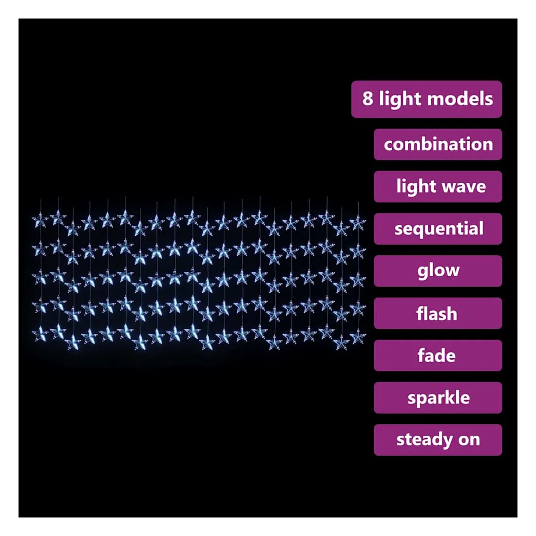 vidaXLCe rideau lumineux à LED à étoiles est excellent pour une utilisation comme un complément d’éclairage à tout projet décoratif. Il est adapté pour Noël, fêtes, mariages et autres jours fériés. La guirlande lumineuse est équipée de 500 LED à économie d’énergie, créant une performance d’éclairage magique. Elle dispose de 8 effets lumineux différents : mode combiné, vagues, mode séquentiel, mode de lueur lente, clignotement, mode d'atténuation lente, scintillement et éclairage continu. C’est un excellent accessoire décoratif pour éclairer les espaces intérieurs et extérieurs. Remarque: l'USB inclus n'est pas étanche, donc cette partie doit éviter l'eau, mais grâce au câble de 3 m, la décoration de Noël peut être utilisée à l’extérieur car le câble et le produit sont étanches. Ce produit est doté d'un connecteur USB, mais la source d'alimentation certifiée de USB 5V n'est pas incluse.