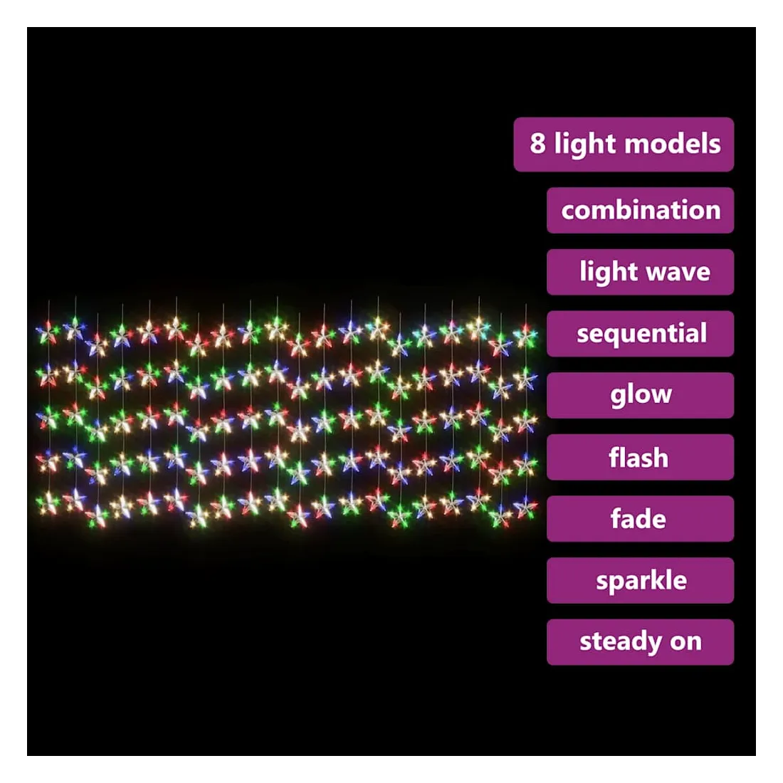 vidaXLCe rideau lumineux à LED à étoiles est excellent pour une utilisation comme un complément d’éclairage à tout projet décoratif. Il est adapté pour Noël, fêtes, mariages et autres jours fériés. La guirlande lumineuse est équipée de 500 LED à économie d’énergie, créant une performance d’éclairage magique. Elle dispose de 8 effets lumineux différents : mode combiné, vagues, mode séquentiel, mode de lueur lente, clignotement, mode d'atténuation lente, scintillement et éclairage continu. C’est un excellent accessoire décoratif pour éclairer les espaces intérieurs et extérieurs. Remarque: l'USB inclus n'est pas étanche, donc cette partie doit éviter l'eau, mais grâce au câble de 3 m, la décoration de Noël peut être utilisée à l’extérieur car le câble et le produit sont étanches. Ce produit est doté d'un connecteur USB, mais la source d'alimentation certifiée de USB 5V n'est pas incluse.