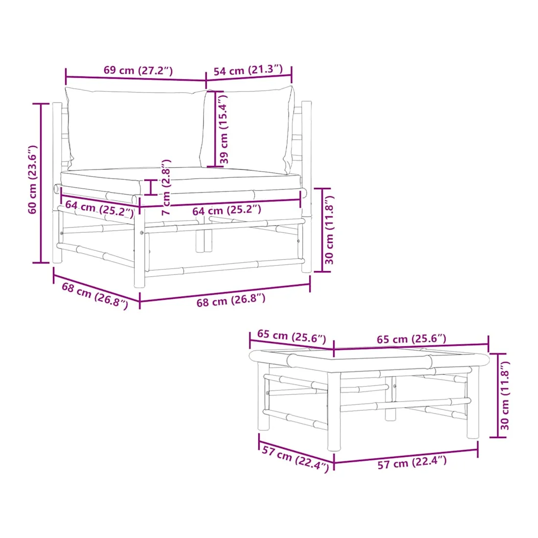 Créez un coin salon relaxant avec cet élégant salon de jardin. Cet ensemble de meubles d'extérieur est fabriqué en bambou, ce qui le rend robuste et facile à nettoyer. Les coussins de siège et de dossier bien rembourrés ajoutent du confort supplémentaire à votre temps de détente. La table d’appoint est idéale pour placer les aliments et les boissons à portée de main. Avec une construction légère, l’ensemble de meubles est facile à déplacer. Vous pouvez placer l’ensemble dans n’importe quel arrangement selon votre préférence, grâce à la conception modulaire. Remarque : Afin de prolonger la durée de vie de vos meubles d'extérieur, nous vous recommandons de les nettoyer régulièrement et de ne pas les laisser à l'extérieur sans protection inutilement.Nettoyage : Utiliser une solution savonneuse douceStockage : Si possible, stockez dans un endroit frais et sec à l'intérieur. Si le produit est stocké à l'extérieur, protégez-le avec une housse imperméable. Essuyez et séchez l'excès d'eau ou de neige des surfaces planes après la pluie ou une chute de neige. Permettez une circulation d'air suffisante afin d'éviter les dommages liés à l'humidité.