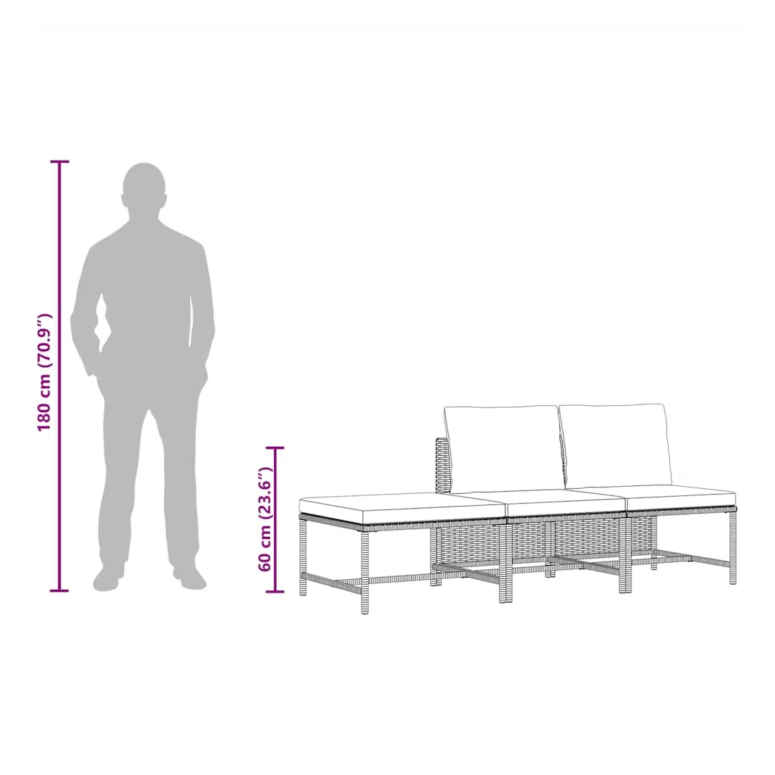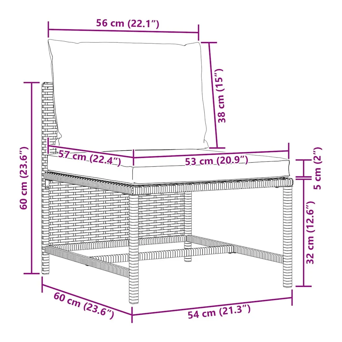 - Dimensions du canapé de milieu : 54 x 60 x 60 cm (l x P x H)