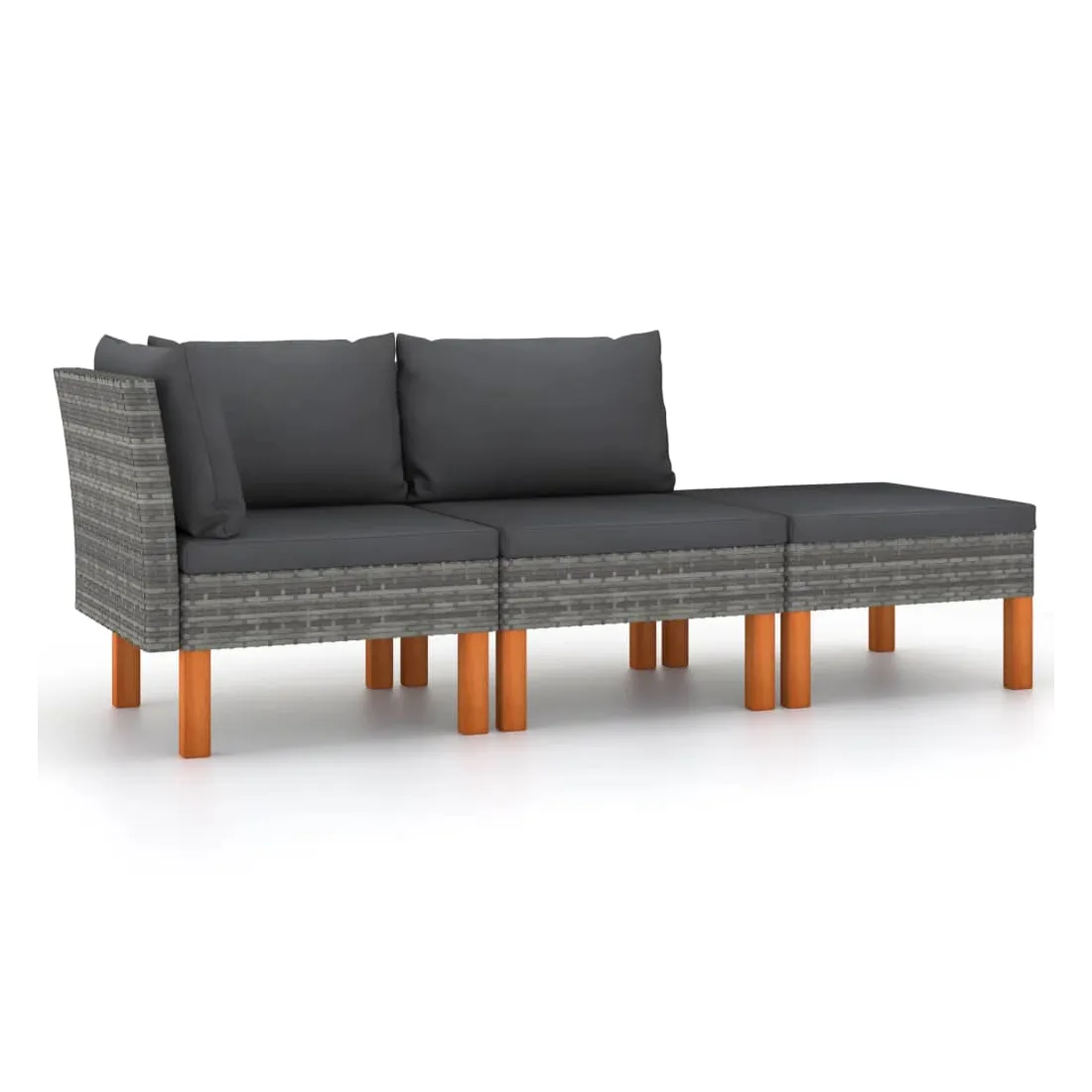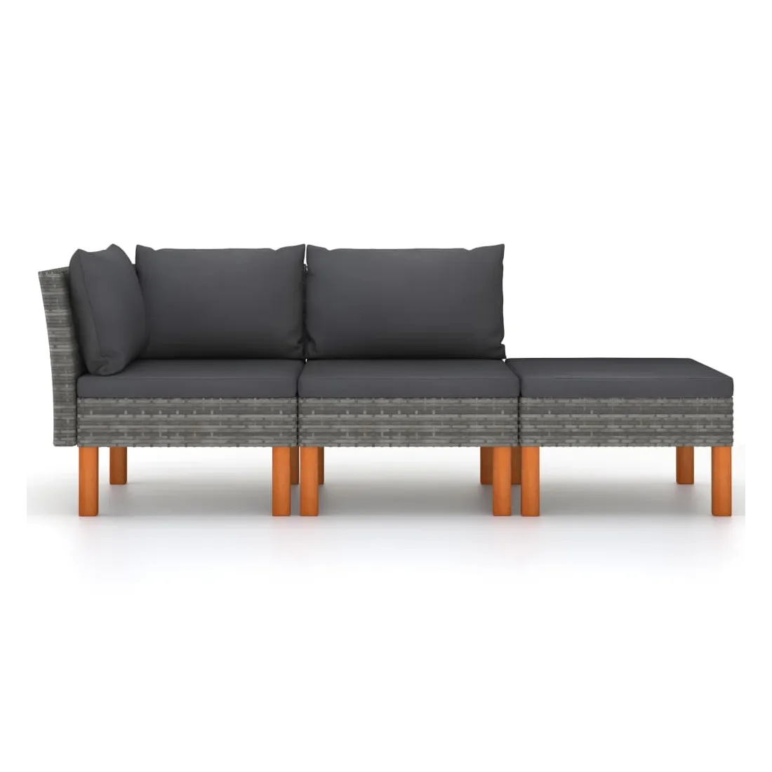Cet ensemble de salon de jardin est un choix excellent pour vous détendre et profiter du bon temps, faire une sieste ou discuter avec votre famille ou vos amis. Doté d’un cadre en acier enduit de poudre recouvert de résine tressée, cet ensemble de meubles de patio est robuste et facile à nettoyer. Les pieds en bois d’eucalyptus massif contribuent à leur robustesse et à leur stabilité. De plus, les coussins ajoutent un confort supplémentaire à votre temps de détente. Équipées de fermetures éclair, les housses de coussin sont amovibles et lavables. Grâce à la construction légère en résine tressée, vous pouvez déplacer facilement le salon de jardin. Remarque importante : Nous vous recommandons de couvrir le salon de jardin pendant la pluie, la neige et le gel pour une utilisation durable.