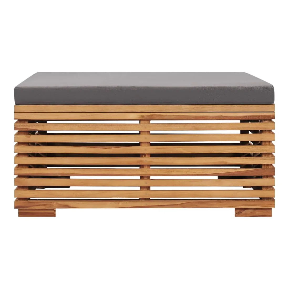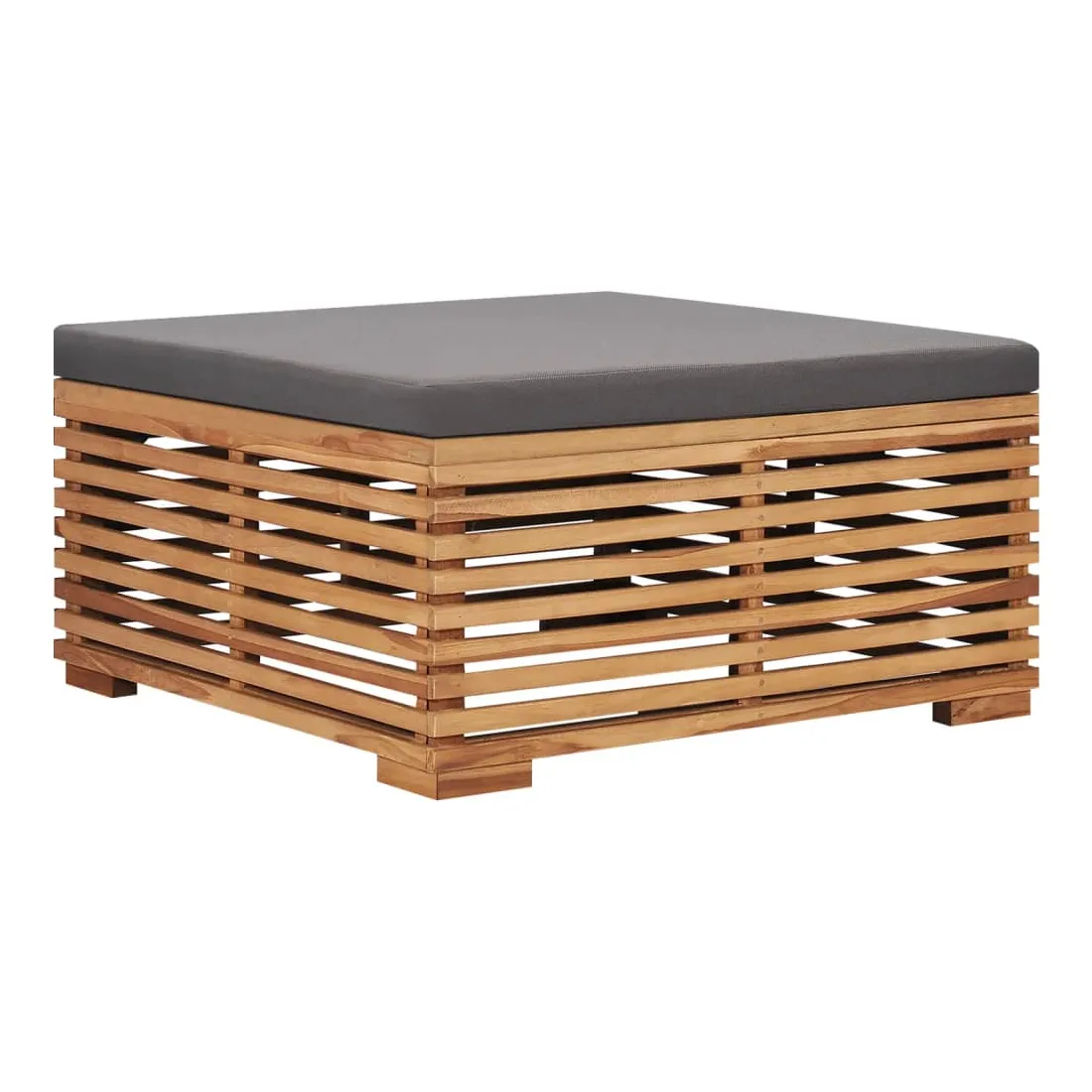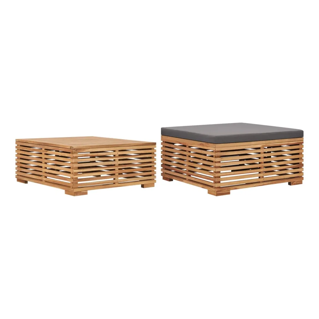 vidaXLCet ensemble de table de jardin et de repose-pied en bois, qui se distingue par son design à lattes, sera un excellent supplément à votre jardin, terrasse ou patio pour discuter avec votre famille et vos amis ou simplement profiter du bon temps. Fabriquée en bois dur de teck extrêmement durable, cette pièce de meuble en teck a été chevronnée, séchée au four puis finement poncée pour lui donner un aspect très lisse. Le bois de teck est connu pour sa résistance exceptionnelle aux intempéries, ce qui le rend bien plus adapté aux meubles de jardin que tout autre type de bois. Le bois de teck est le choix idéal si vous souhaitez acheter un meuble de jardin durable. Le coussin d'assise bien rembourré assure un confort optimal. La surface poncée est facile à nettoyer avec un chiffon humide, ce qui la rend adaptée à un usage extérieur. Le repose-pied peut être utilisé comme une table basse sans le coussin. Remarque : Afin de prolonger la durée de vie de vos meubles d'extérieur, nous vous recommandons de les nettoyer régulièrement et de ne pas les laisser à l'extérieur sans protection inutilement.Nettoyage : Utiliser une solution savonneuse douce.Stockage : Si possible, stockez dans un endroit frais et sec à l'intérieur. Si le produit est stocké à l'extérieur, protégez-le avec une housse imperméable. Essuyez et séchez l'excès d'eau ou de neige des surfaces planes après la pluie ou une chute de neige. Permettez une circulation d'air suffisante afin d'éviter les dommages liés à l'humidité.
