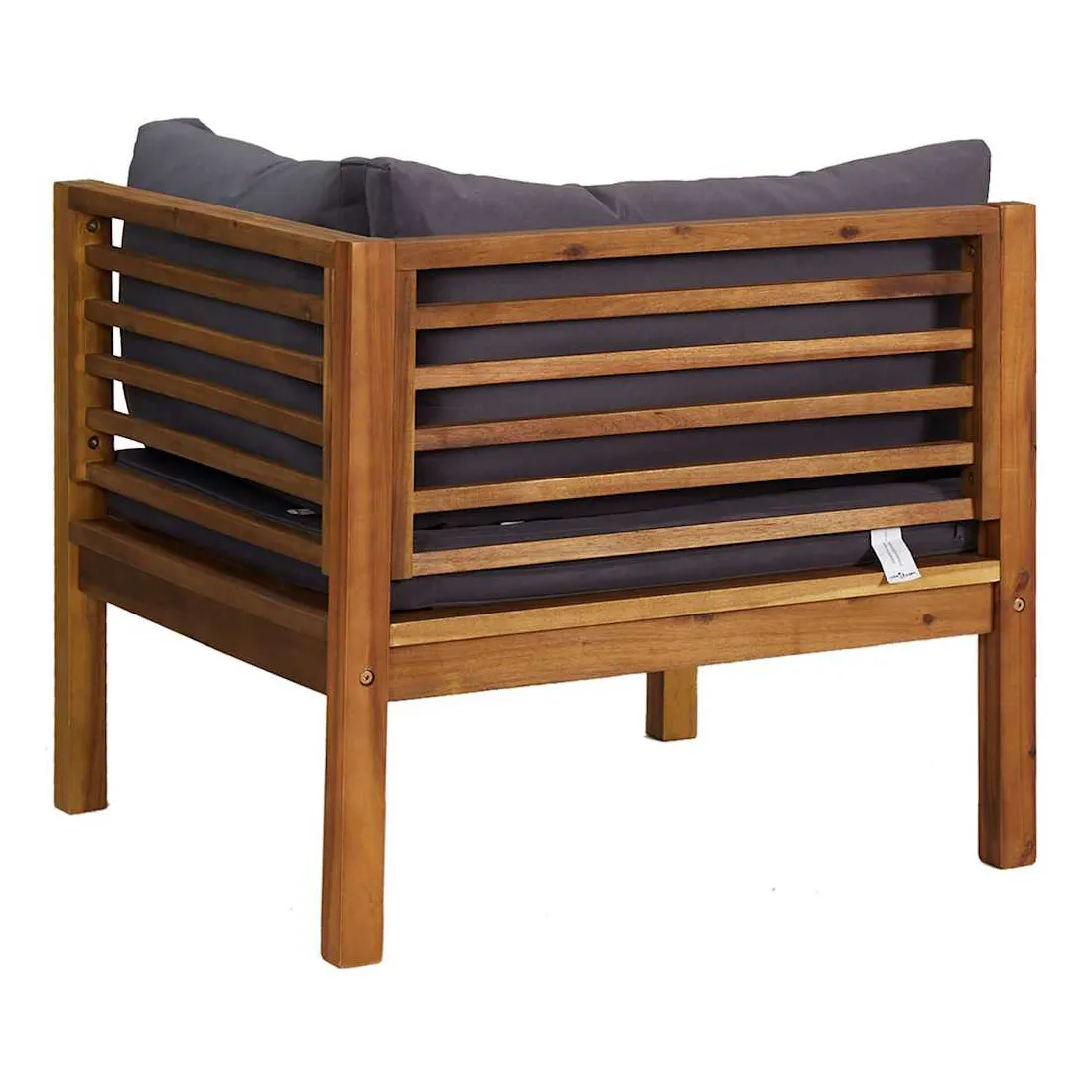Cet ensemble de canapé d'angle sectionnel en bois allie style et fonctionnalité et est conçu pour être utilisé à l’extérieur toute l’année. Fabriqué en bois d’acacia massif, le siège d'angle est solide, robuste et durable. Sa finition à l'huile rend le canapé adapté à une utilisation dehors. Les coussins d'assise et de dossier rembourrés offrent le confort suprême pendant votre expérience d'assise. Vous pouvez le combiner avec d'autres segments modulaires disponibles pour créer vos propres configurations de salon de jardin ! Remarque : afin de prolonger la durée de vie de vos meubles d'extérieur, nous vous recommandons de les nettoyer régulièrement et de ne pas les laisser à l'extérieur sans protection inutilement.Nettoyage : utiliser une solution savonneuse douceStockage : si possible, stockez dans un endroit frais et sec à l'intérieur. Si le produit est stocké à l'extérieur, protégez-le avec une housse imperméable. Essuyez et séchez l'excès d'eau ou de neige des surfaces planes après la pluie ou une chute de neige. Permettez une circulation d'air suffisante afin d'éviter les dommages liés à l'humidité.