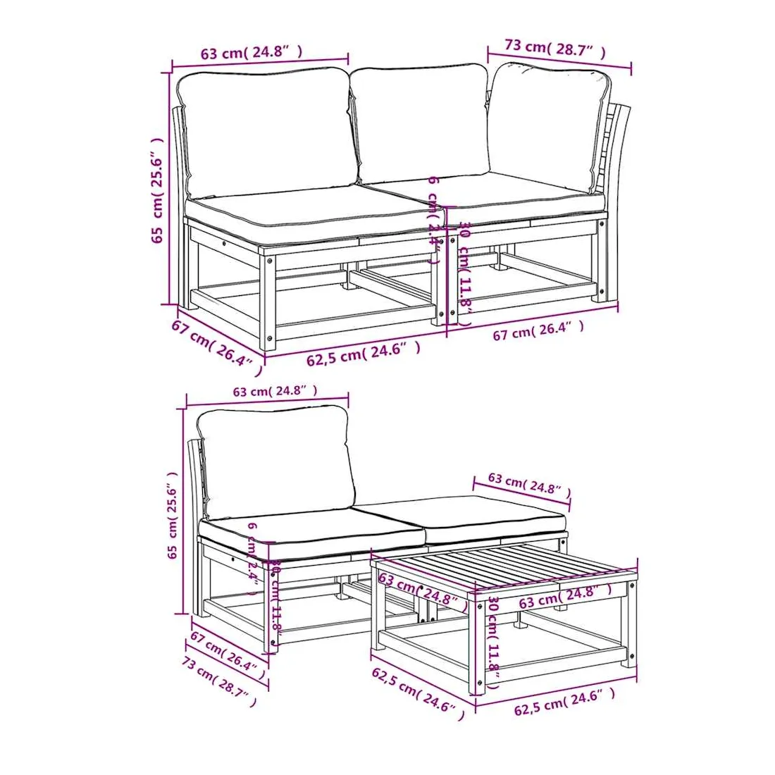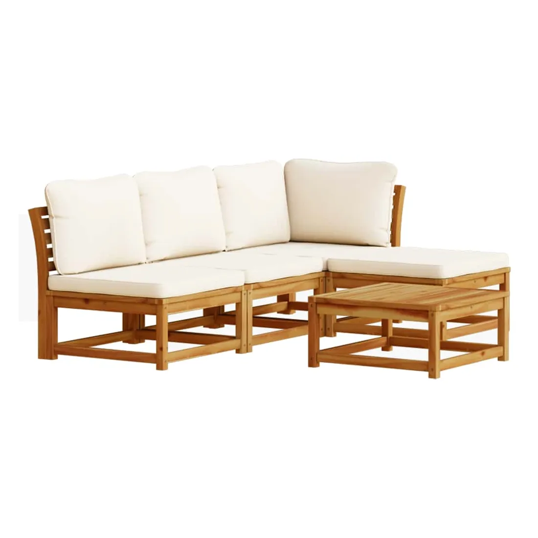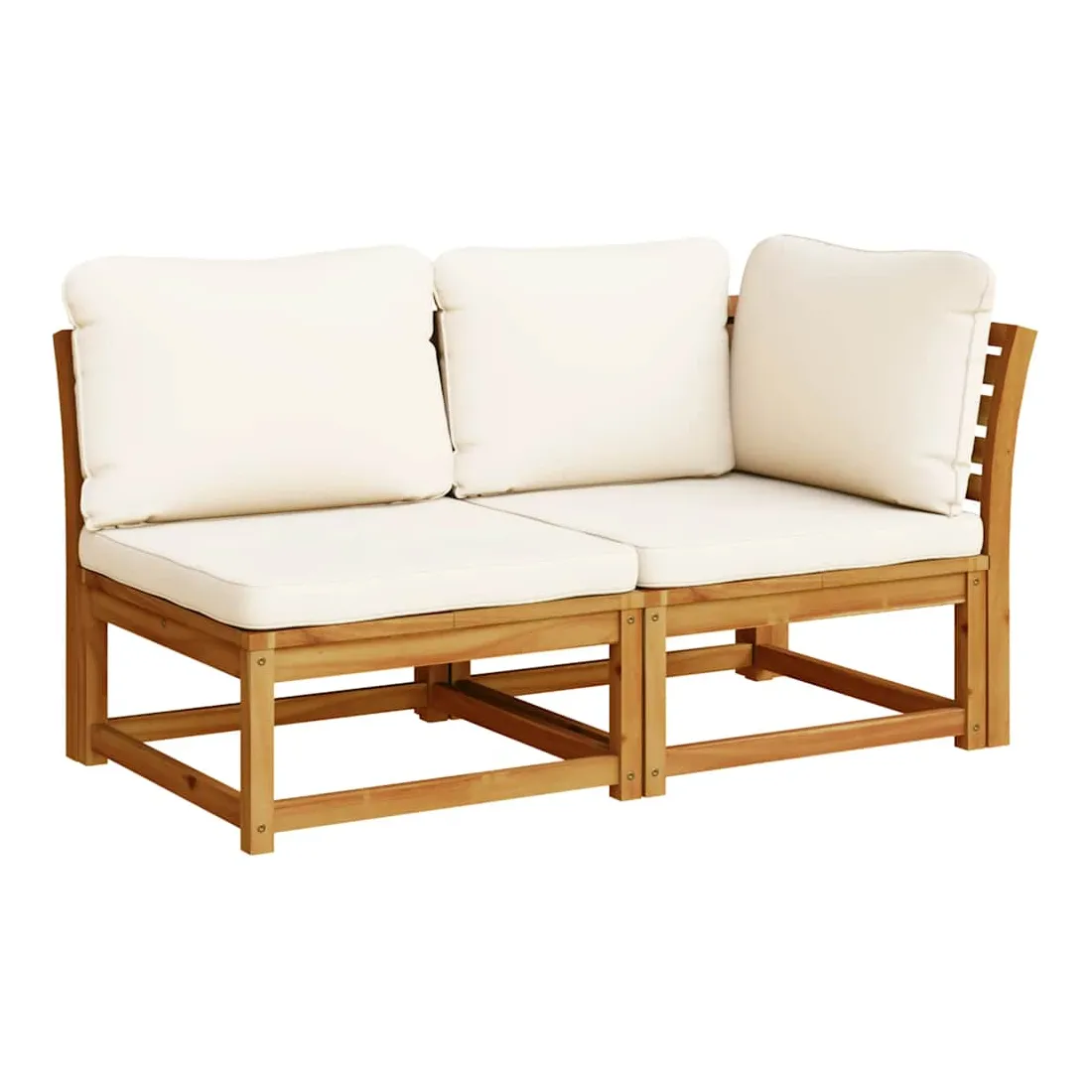 Cet ensemble de salon de jardin en bois avec coussins a un design élégant et constitue un excellent choix pour vous détendre et profiter du jardin ou du patio. Bois d'acacia massif : le bois d'acacia massif est un matériau naturel magnifique. Le bois d'acacia un bois dur tropical, qui est dense, robuste et durable.Expérience d'assise confortable : le dossier et les coussins rembourrés rendent l’ensemble de canapé de jardin plus confortable pour s'asseoir.Conception à lattes : la conception à lattes de l’ensemble de meubles en bois empêche efficacement l'eau de s'accumuler, ce qui garantit que l'assise reste sèche et exempte de tout risque de pourriture.Conception modulaire : cet ensemble de meubles d'extérieur a une conception modulaire, ce qui le rend complètement flexible et facile à déplacer, afin que vous puissiez créer un agencement de meubles d'extérieur personnalisé. Bon à savoir :Pour que vos meubles d'extérieur restent beaux, nous vous recommandons de les protéger avec une housse imperméable.