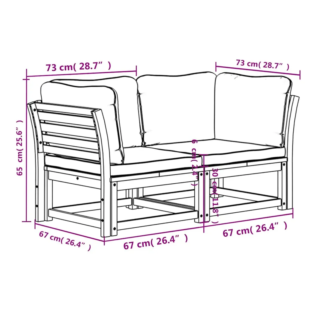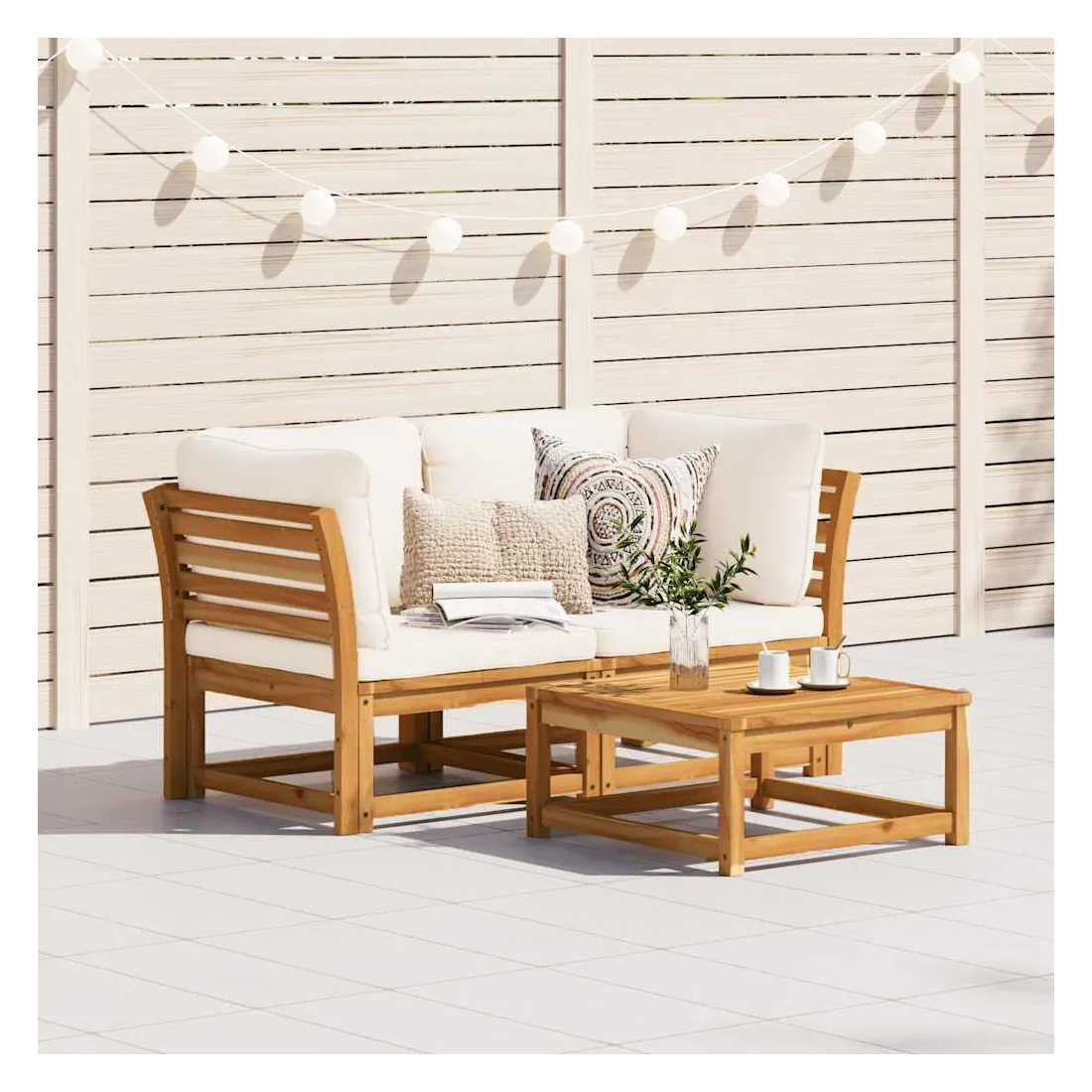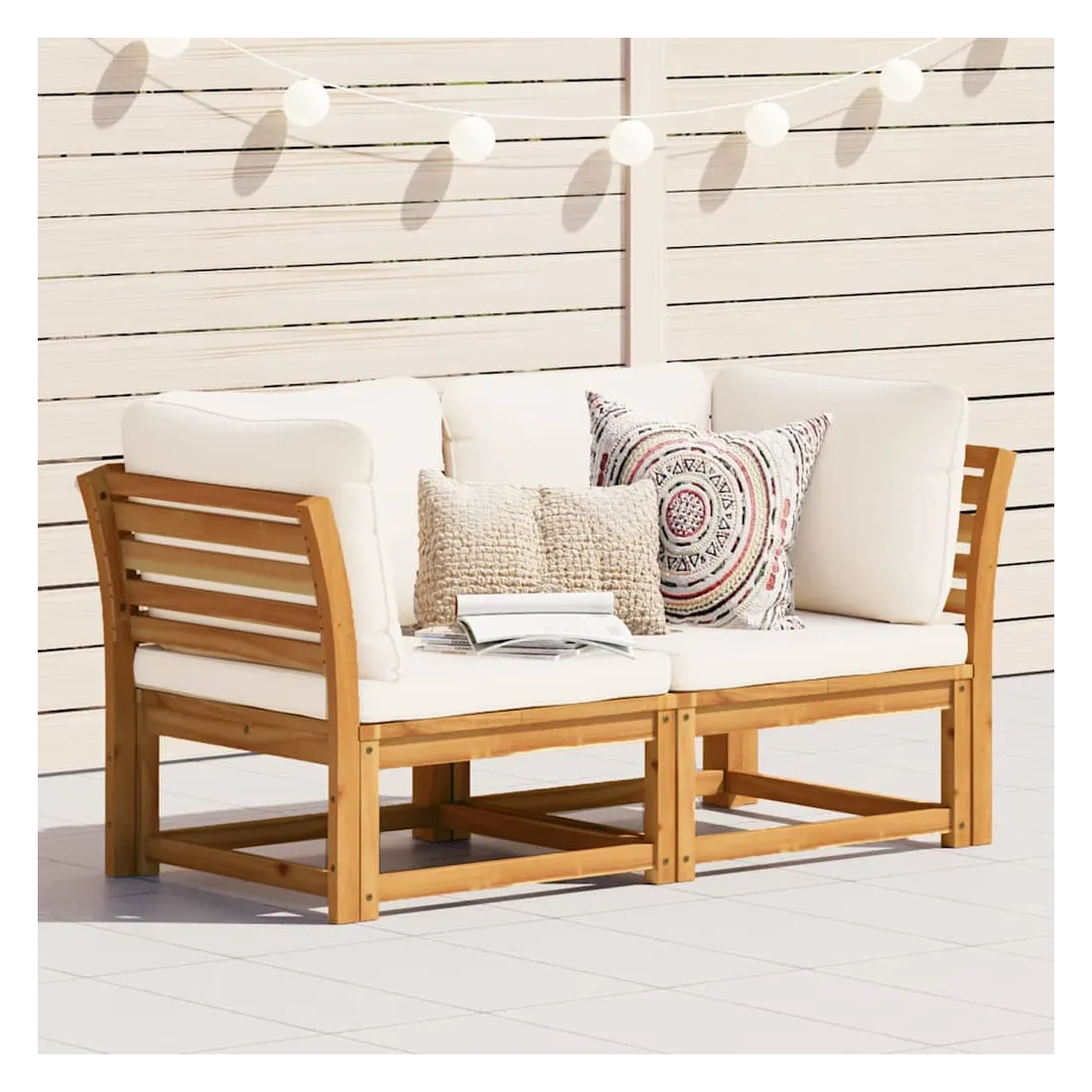 Ce canapé de jardin en bois avec coussins a un design élégant et constitue un excellent choix pour vous détendre et profiter du jardin ou du patio. Bois d'acacia massif : le bois d'acacia massif est un matériau naturel magnifique. Le bois d'acacia un bois dur tropical, qui est dense, robuste et durable.Expérience d'assise confortable : le dossier et les coussins bien rembourrés rendent le canapé de jardin plus confortable pour s'asseoir.Conception à lattes : la conception à lattes de l’ensemble de meubles en bois empêche efficacement l'eau de s'accumuler, ce qui garantit que l'assise reste sèche et exempte de tout risque de pourriture.Design modulaire : ce canapé d'extérieur présente un design modulaire, ce qui le rend totalement flexible et facile à déplacer pour s'adapter à n'importe quel environnement, de sorte que vous puissiez créer un arrangement de mobilier d'extérieur personnalisé. Bon à savoir :Pour que vos meubles d'extérieur restent beaux, nous vous recommandons de les protéger avec une housse imperméable.