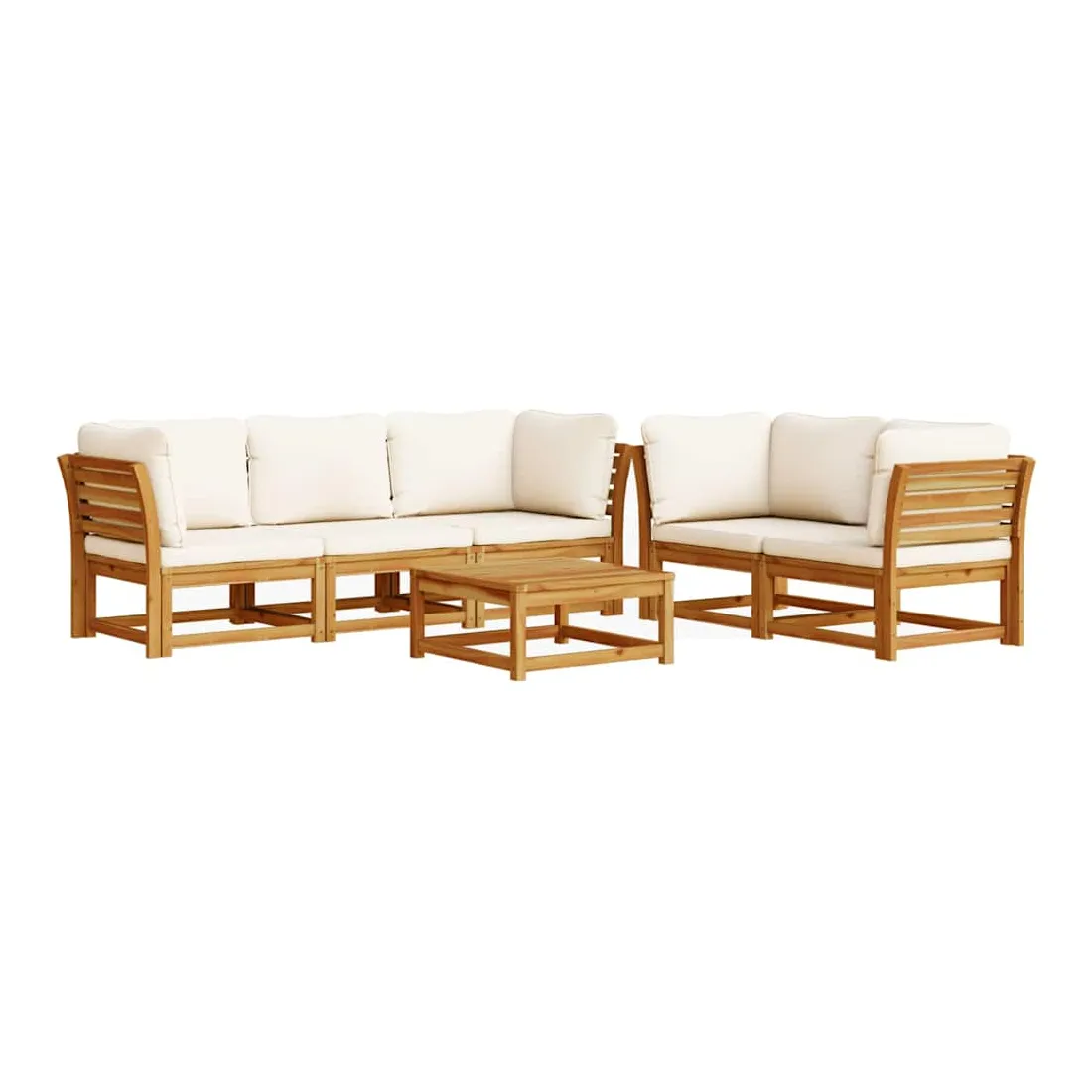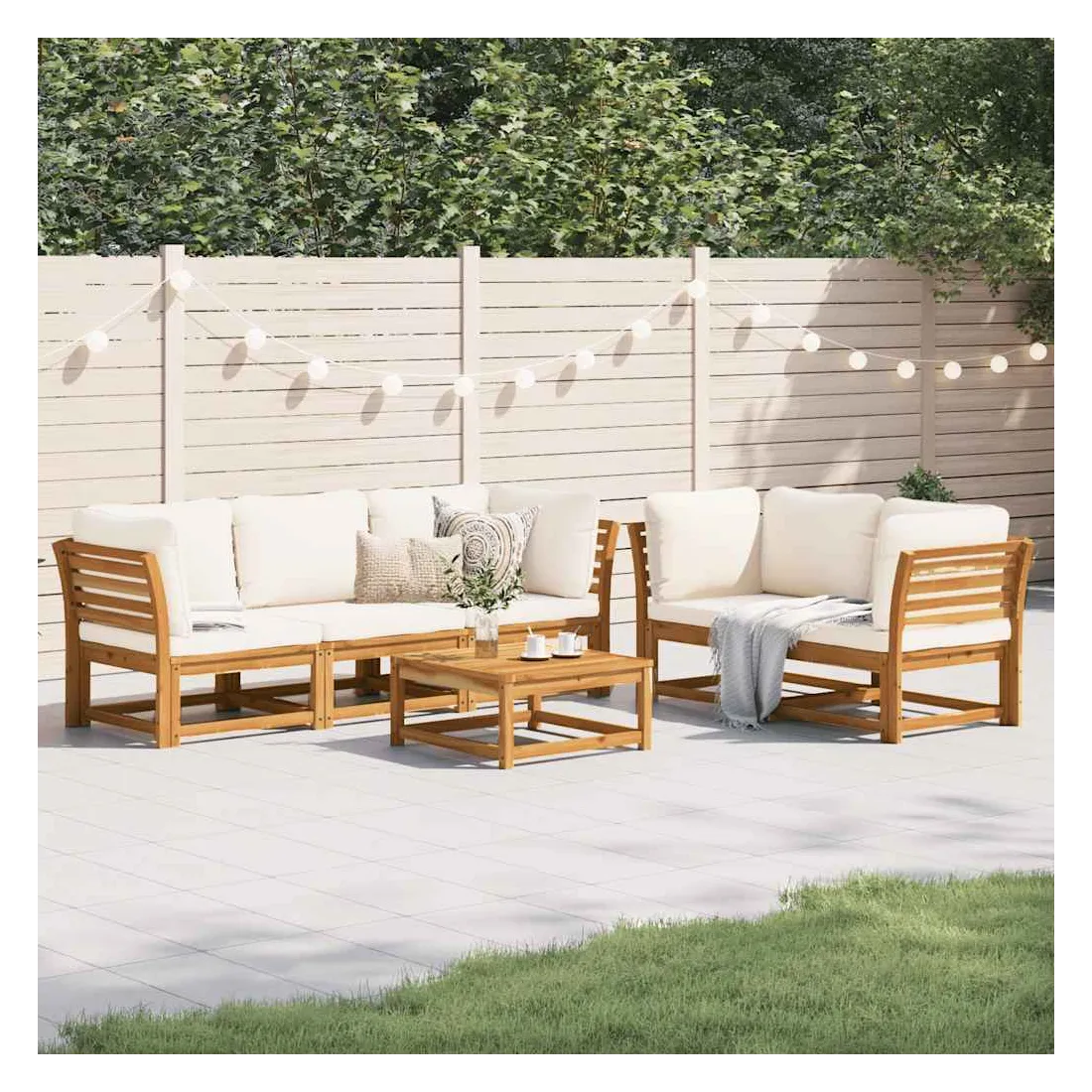 Cet ensemble de salon de jardin en bois avec coussins a un design élégant et constitue un excellent choix pour vous détendre et profiter du jardin ou du patio. Bois d'acacia massif : le bois d'acacia massif est un matériau naturel magnifique. Le bois d'acacia un bois dur tropical, qui est dense, robuste et durable.Expérience d'assise confortable : le dossier et les coussins rembourrés rendent l’ensemble de canapé de jardin plus confortable pour s'asseoir.Conception à lattes : la conception à lattes de l’ensemble de meubles en bois empêche efficacement l'eau de s'accumuler, ce qui garantit que l'assise reste sèche et exempte de tout risque de pourriture.Conception modulaire : cet ensemble de meubles d'extérieur a une conception modulaire, ce qui le rend complètement flexible et facile à déplacer, afin que vous puissiez créer un agencement de meubles d'extérieur personnalisé. Bon à savoir :Pour que vos meubles d'extérieur restent beaux, nous vous recommandons de les protéger avec une housse imperméable.