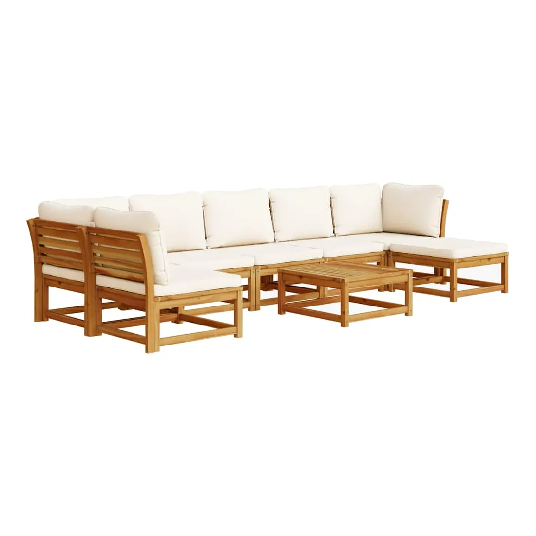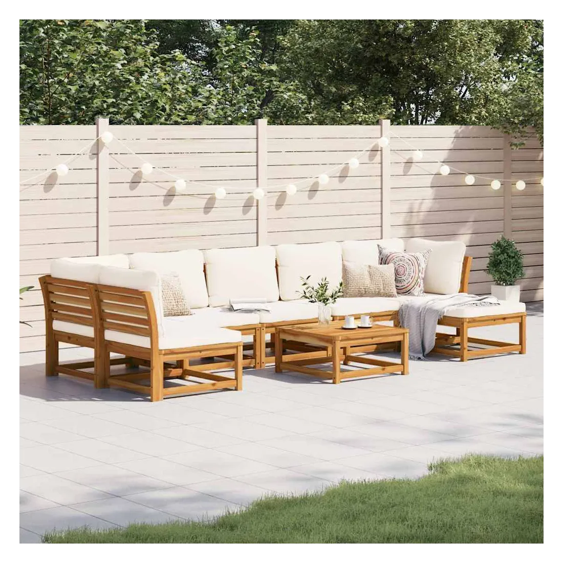 Cet ensemble de salon de jardin en bois avec coussins a un design élégant et constitue un excellent choix pour vous détendre et profiter du jardin ou du patio. Bois d'acacia massif : le bois d'acacia massif est un matériau naturel magnifique. Le bois d'acacia un bois dur tropical, qui est dense, robuste et durable.Expérience d'assise confortable : le dossier et les coussins rembourrés rendent l’ensemble de canapé de jardin plus confortable pour s'asseoir.Conception à lattes : la conception à lattes de l’ensemble de meubles en bois empêche efficacement l'eau de s'accumuler, ce qui garantit que l'assise reste sèche et exempte de tout risque de pourriture.Conception modulaire : cet ensemble de meubles d'extérieur a une conception modulaire, ce qui le rend complètement flexible et facile à déplacer, afin que vous puissiez créer un agencement de meubles d'extérieur personnalisé. Bon à savoir :Pour que vos meubles d'extérieur restent beaux, nous vous recommandons de les protéger avec une housse imperméable.