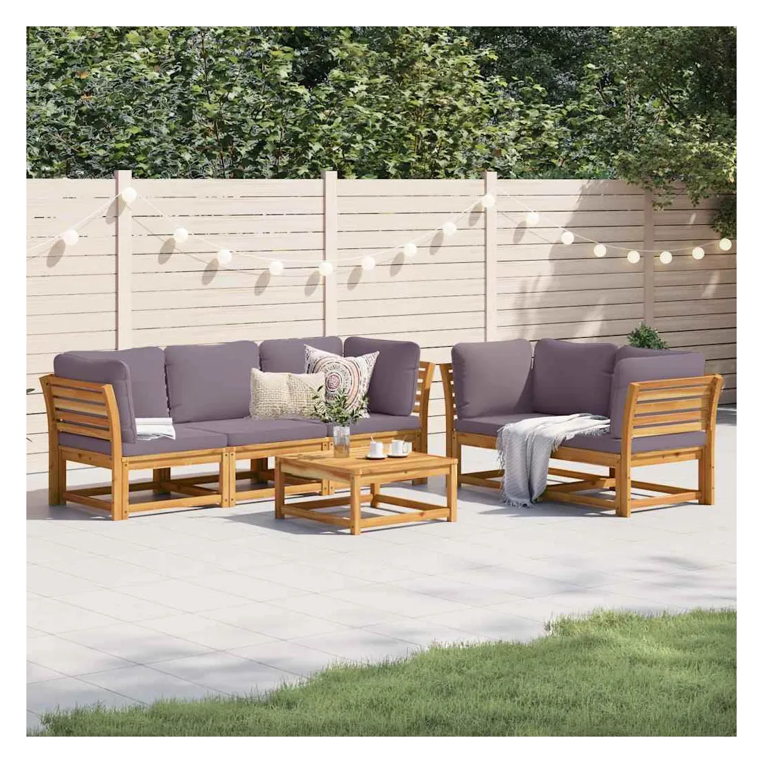 Cet ensemble de salon de jardin en bois avec coussins a un design élégant et constitue un excellent choix pour vous détendre et profiter du jardin ou du patio. Bois d'acacia massif : le bois d'acacia massif est un matériau naturel magnifique. Le bois d'acacia un bois dur tropical, qui est dense, robuste et durable.Expérience d'assise confortable : le dossier et les coussins rembourrés rendent l’ensemble de canapé de jardin plus confortable pour s'asseoir.Conception à lattes : la conception à lattes de l’ensemble de meubles en bois empêche efficacement l'eau de s'accumuler, ce qui garantit que l'assise reste sèche et exempte de tout risque de pourriture.Conception modulaire : cet ensemble de meubles d'extérieur a une conception modulaire, ce qui le rend complètement flexible et facile à déplacer, afin que vous puissiez créer un agencement de meubles d'extérieur personnalisé. Bon à savoir :Pour que vos meubles d'extérieur restent beaux, nous vous recommandons de les protéger avec une housse imperméable.