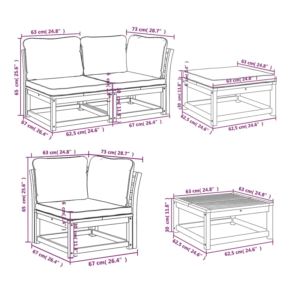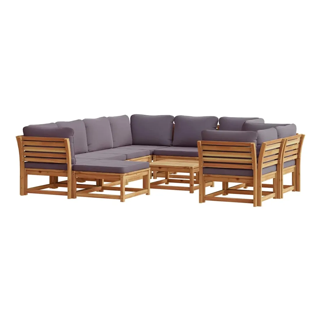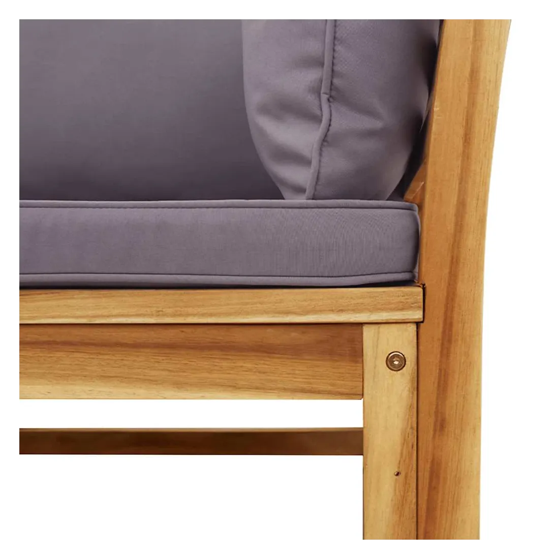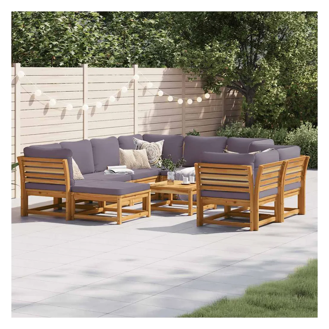 Cet ensemble de salon de jardin en bois avec coussins a un design élégant et constitue un excellent choix pour vous détendre et profiter du jardin ou du patio. Bois d'acacia massif : le bois d'acacia massif est un matériau naturel magnifique. Le bois d'acacia un bois dur tropical, qui est dense, robuste et durable.Expérience d'assise confortable : le dossier et les coussins rembourrés rendent l’ensemble de canapé de jardin plus confortable pour s'asseoir.Conception à lattes : la conception à lattes de l’ensemble de meubles en bois empêche efficacement l'eau de s'accumuler, ce qui garantit que l'assise reste sèche et exempte de tout risque de pourriture.Conception modulaire : cet ensemble de meubles d'extérieur a une conception modulaire, ce qui le rend complètement flexible et facile à déplacer, afin que vous puissiez créer un agencement de meubles d'extérieur personnalisé. Bon à savoir :Pour que vos meubles d'extérieur restent beaux, nous vous recommandons de les protéger avec une housse imperméable.