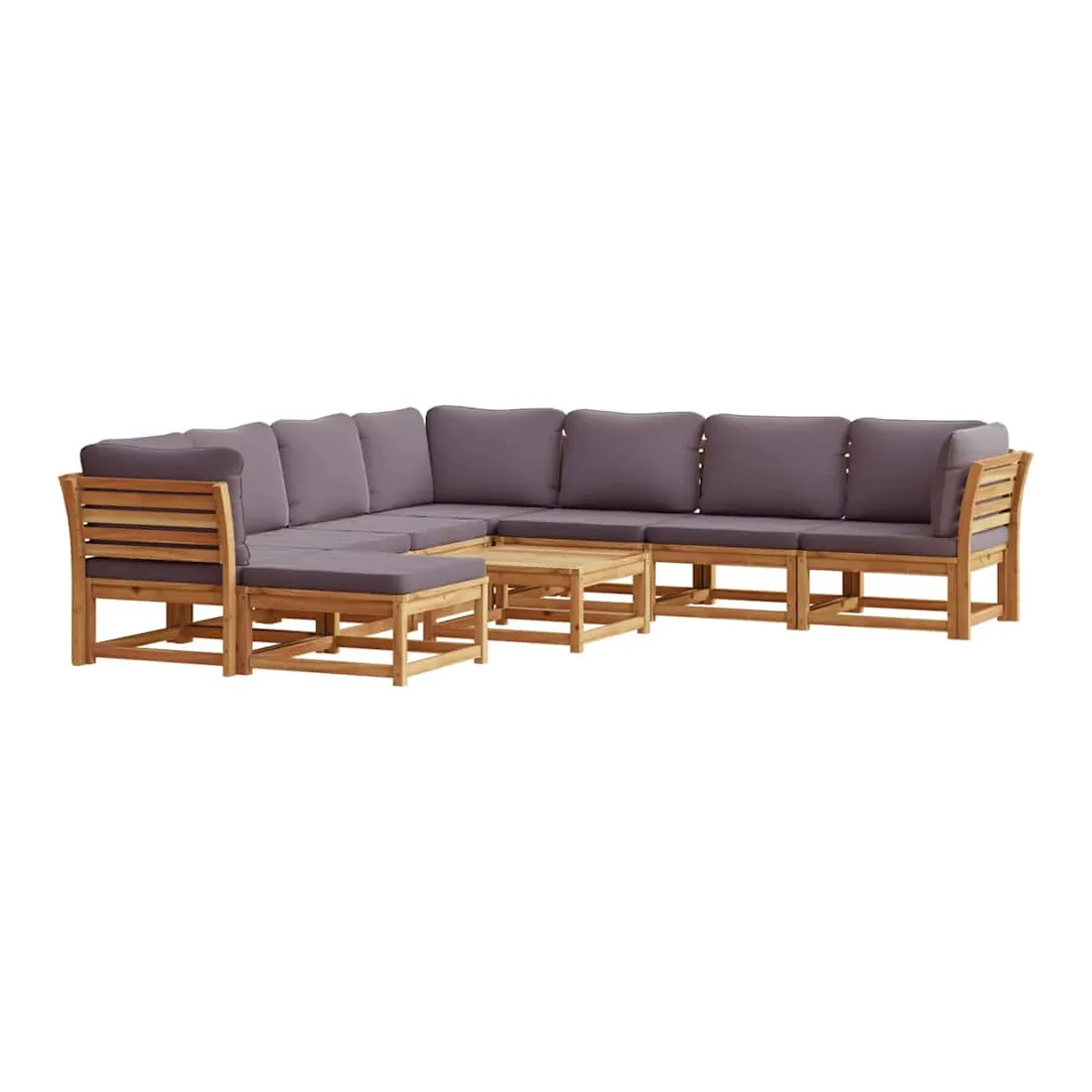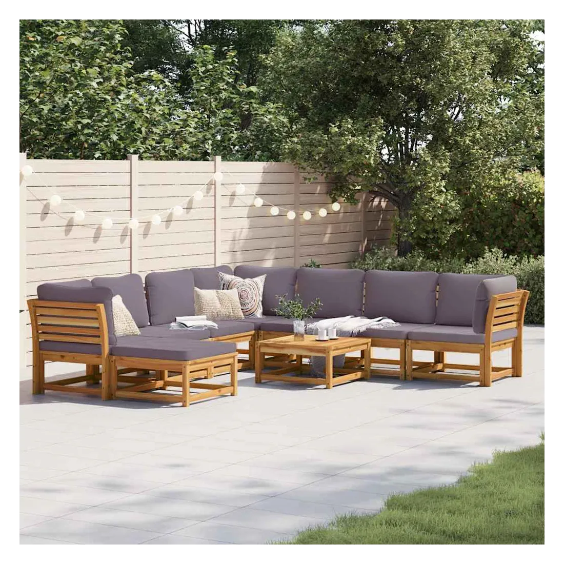 Cet ensemble de salon de jardin en bois avec coussins a un design élégant et constitue un excellent choix pour vous détendre et profiter du jardin ou du patio. Bois d'acacia massif : le bois d'acacia massif est un matériau naturel magnifique. Le bois d'acacia un bois dur tropical, qui est dense, robuste et durable.Expérience d'assise confortable : le dossier et les coussins rembourrés rendent l’ensemble de canapé de jardin plus confortable pour s'asseoir.Conception à lattes : la conception à lattes de l’ensemble de meubles en bois empêche efficacement l'eau de s'accumuler, ce qui garantit que l'assise reste sèche et exempte de tout risque de pourriture.Conception modulaire : cet ensemble de meubles d'extérieur a une conception modulaire, ce qui le rend complètement flexible et facile à déplacer, afin que vous puissiez créer un agencement de meubles d'extérieur personnalisé. Bon à savoir :Pour que vos meubles d'extérieur restent beaux, nous vous recommandons de les protéger avec une housse imperméable.