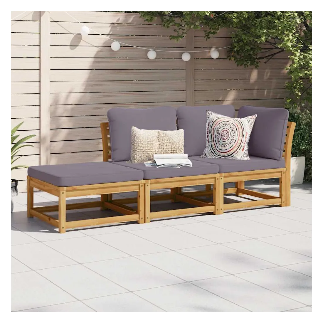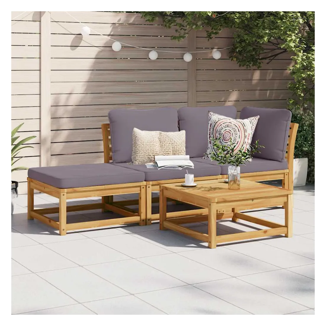 Cet ensemble de salon de jardin en bois avec coussins a un design élégant et constitue un excellent choix pour vous détendre et profiter du jardin ou du patio. Bois d'acacia massif : le bois d'acacia massif est un matériau naturel magnifique. Le bois d'acacia un bois dur tropical, qui est dense, robuste et durable.Expérience d'assise confortable : le dossier et les coussins rembourrés rendent l’ensemble de canapé de jardin plus confortable pour s'asseoir.Conception à lattes : la conception à lattes de l’ensemble de meubles en bois empêche efficacement l'eau de s'accumuler, ce qui garantit que l'assise reste sèche et exempte de tout risque de pourriture.Conception modulaire : cet ensemble de meubles d'extérieur a une conception modulaire, ce qui le rend complètement flexible et facile à déplacer, afin que vous puissiez créer un agencement de meubles d'extérieur personnalisé. Bon à savoir :Pour que vos meubles d'extérieur restent beaux, nous vous recommandons de les protéger avec une housse imperméable.