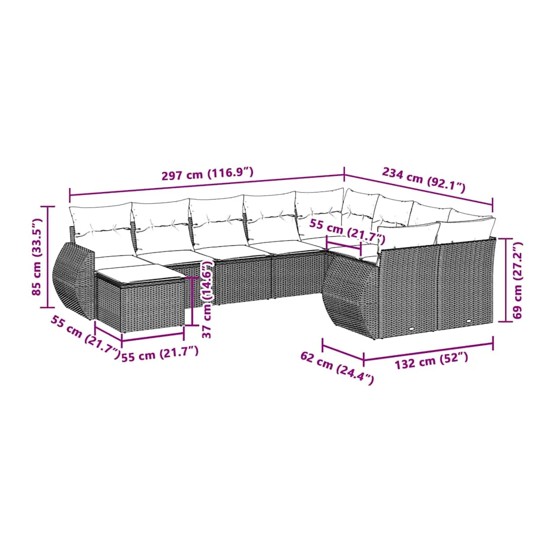 • 9 x coussin d'assise avec housse amovible et lavable